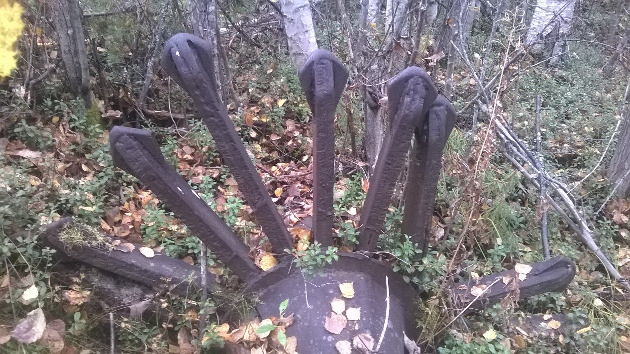 Сей инструмент -- орудие восстановления лесов на вырубках. Называется якорный покровосдиратель. Его тащили трактором, он сдирал мох, а на обнаженную землю сыпали семена и выростали ели и сосны.
