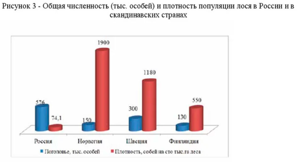 Поголовье зимующего стада лосей в России (576 тыс. особей) и Скандинавских странах (580 тыс. особей) по состоянию на 2005 г. было примерно одинаковым, тогда как плотность популяций российских лосей (74,1 особи на 100 тыс. га леса) была в 7,4-25,6 раза ниже, чем в Скандинавии, где средняя плотность составила 1015,4 особи на 100 тыс. га леса (рисунок 3).