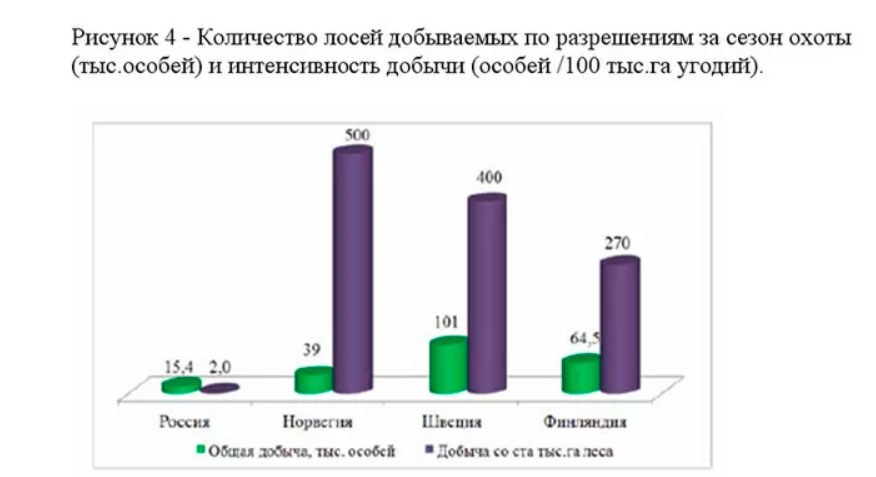 Величина сезонной добычи лосей по разрешениям в России (15.4 тыс. особей) на 189.1 тыс. особей меньше, чем в Скандинавии (204,5 тыс. особей). Интенсивность добычи. характеризуемая количеством добываемых животных со 100 тыс.га угодий, в России (2,0) ниже, чем в скандинавских странах (358 особей) в 179 раз (от 135 до 250 раз по отдельным государствам (рисунок 4).