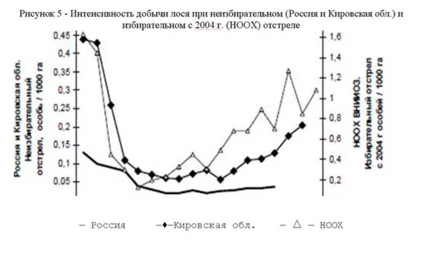 Эти данные четко показывают результат не грамотного управления охотничьими ресурсами в России. Поэтому мы имеем чрезвычайно низкую плотность популяций лося и в такой же степени низкий уровень его опромышления. Можно ли применять опыт Скандинавских стран? Конечно можно следующий пример как раз об этом. В 2004-2013 гг. выполнена работа по избирательному отстрелу лося в научно-опытном охотничьем хозяйстве ВНИИ охоты и звероводства им. Б.М.Житкова (далее НООХ) в целях управления популяциями охотничьих животных. Задача восстановление поголовья лося в НООХ ГНУ ВНИИОЗ. Был разработан состав избирательной добычи, при выборе которого учитывались репродуктивные свойства животных каждой возрастной группы и возможность отличить в полевых условиях нужное животное от других, не подлежащих отстрелу. Доля самок 15 %, 30 %-ной долей сеголетков без разграничения по полу и неизбирательным по возрасту отстрелом самцов в количестве 55 % от квоты. В результатах избирательного отстрела по состоянию на 2010 г. было отмечено значительное (на 44 %) превышение скорости роста численности лося в НООХ над скоростью роста численности в Кировской области. Интенсивность добычи, при неизбирательном отстреле лося в НООХ (1990-2003 гг.) падала синхронно со всей территории России, достигнув минимума в 2000-2003 гг. (рисунок - 5). Начиная с 2004 г., в НООХ, a через 4 года и в Кировской области и России, добыча стала увеличиваться. В 2010 г. она составляла в НООХ 0,706 особи с 1000 га леса, в регионе 0,129, a в целом по России – 0,037 особи с 1000 га. Факт примерно одинаковой интенсивности добычи в НООХ и Кировской области до 2005 г. и резкое расхождение, достигшее к 2012 г. почти 6-ти кратной (в 5,47 раза) величины, уровней тренда интенсивности добычи в регионе и в НООХ, подтверждают положительное влияние избирательного отстрела на величину сезонной добычи, как функцию увеличившихся прироста и численности стада.