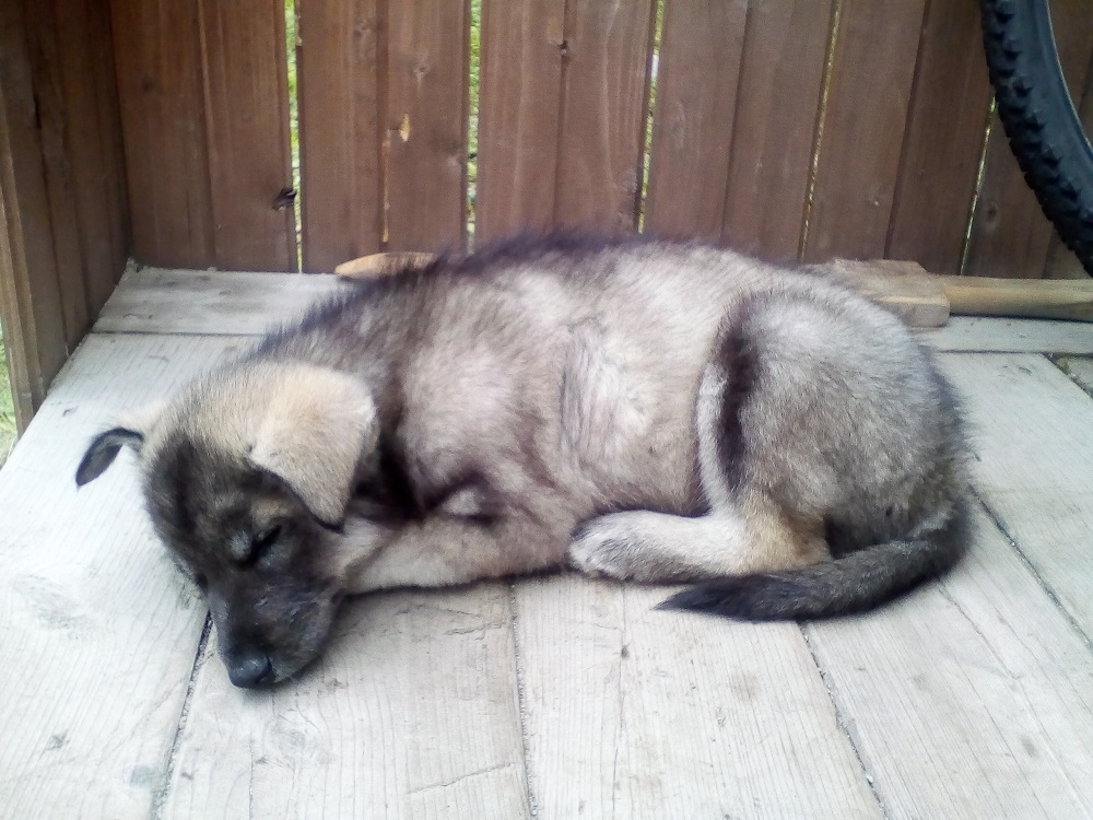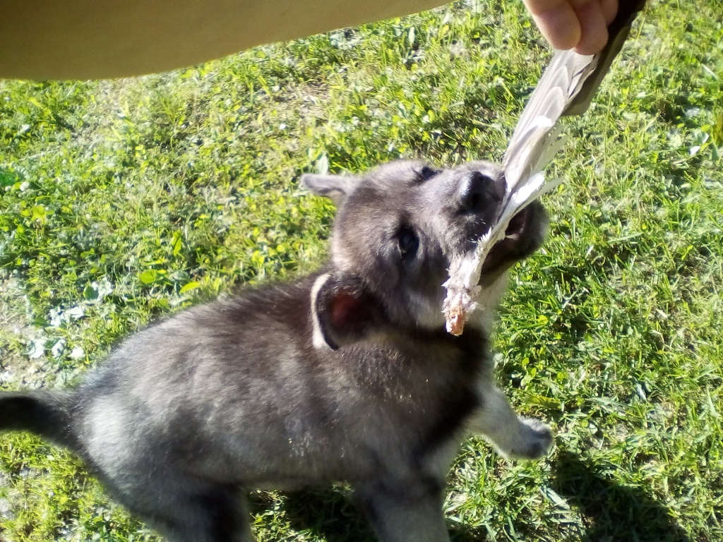 Вчера рыбу после рыбалки чистил, щен тут как тут, аж дрожжит от нетерпения. Поистил плотицу, дал ему, сожрал за милую душу. При том не голоден был. А перед этим щен нас напряг. Приезжаю, значит, с рыбалки. Собаки не видно, походил по участку, звал. Ноль эмоций, поехали с сыном искать, окрестные улицы переулки искатали вдоль и поперек- нет нигде. Вернулись, оставил приоткрытой калитку, еще позвали. И тут это чудо серое из под сарая вылазит. Щемил в свое удовольствие под сараем