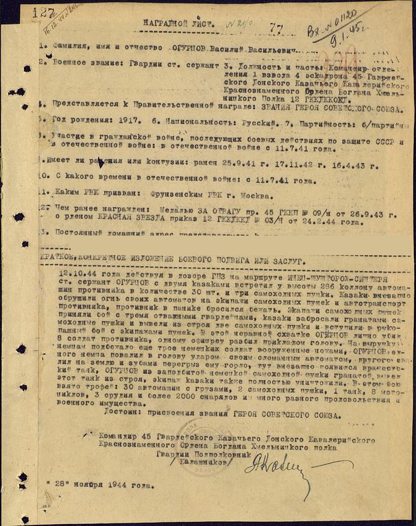 Огурцов Василий Васильевич - командир сабельного отделения 1-го взвода 4-го эскадрона 45-го гвардейского Донского казачьего Краснознамённого кавалерийского полка 12-й гвардейской Донской казачьей Корсуньской Краснознамённой кавалерийской дивизии 5-го гвардейского Донского казачьего Краснознамённого кавалерийского корпуса 2-го Украинского фронта, гвардии старший сержант.