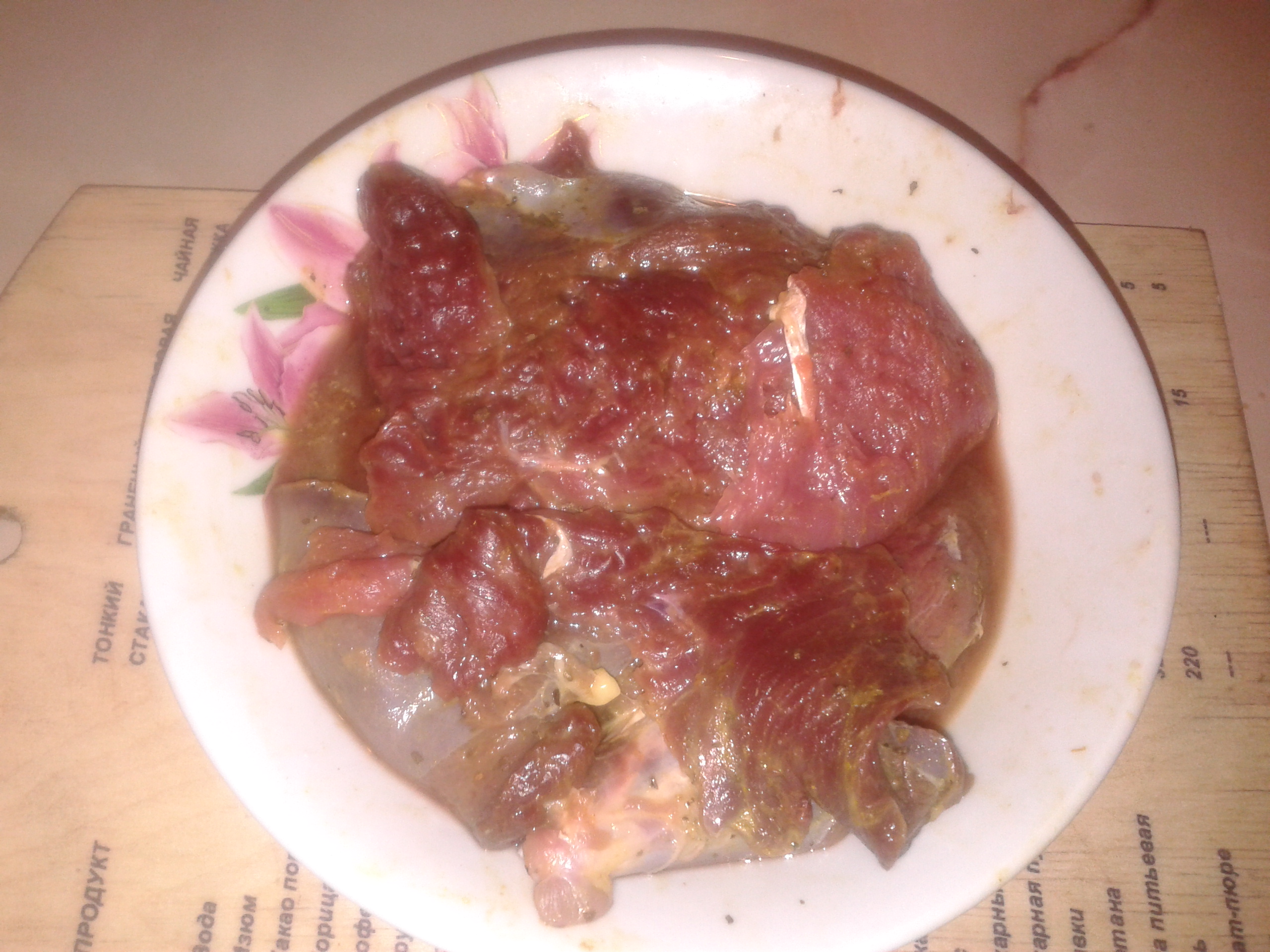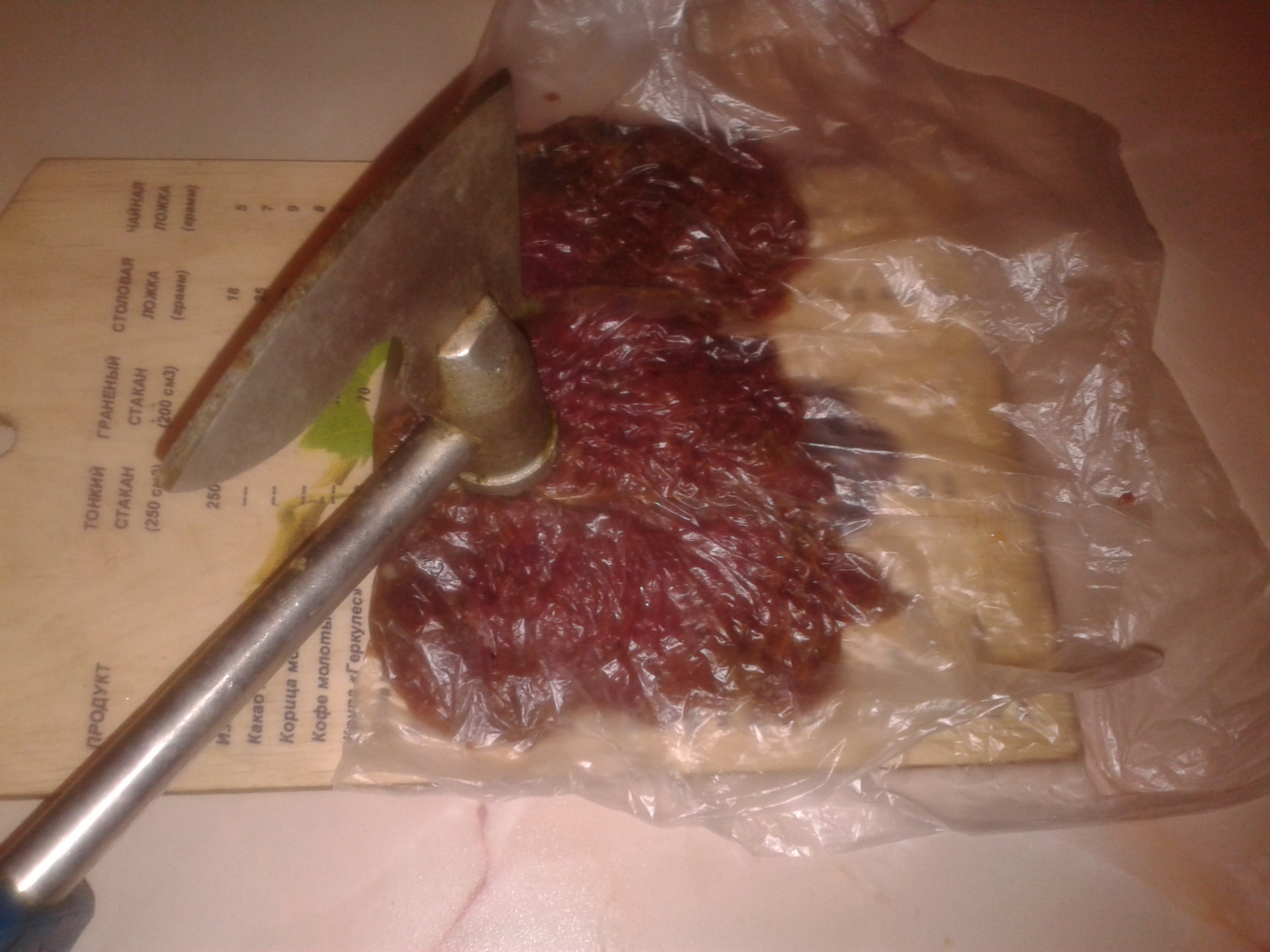 когда помариновалось часик,каждый кусочек отбила молоточком,секрет-делюсь со всеми:чтобы рассол не брызгал по столу,на доску кладём пакет на него мясо,сверху закрываем пакетом и отбиваем!