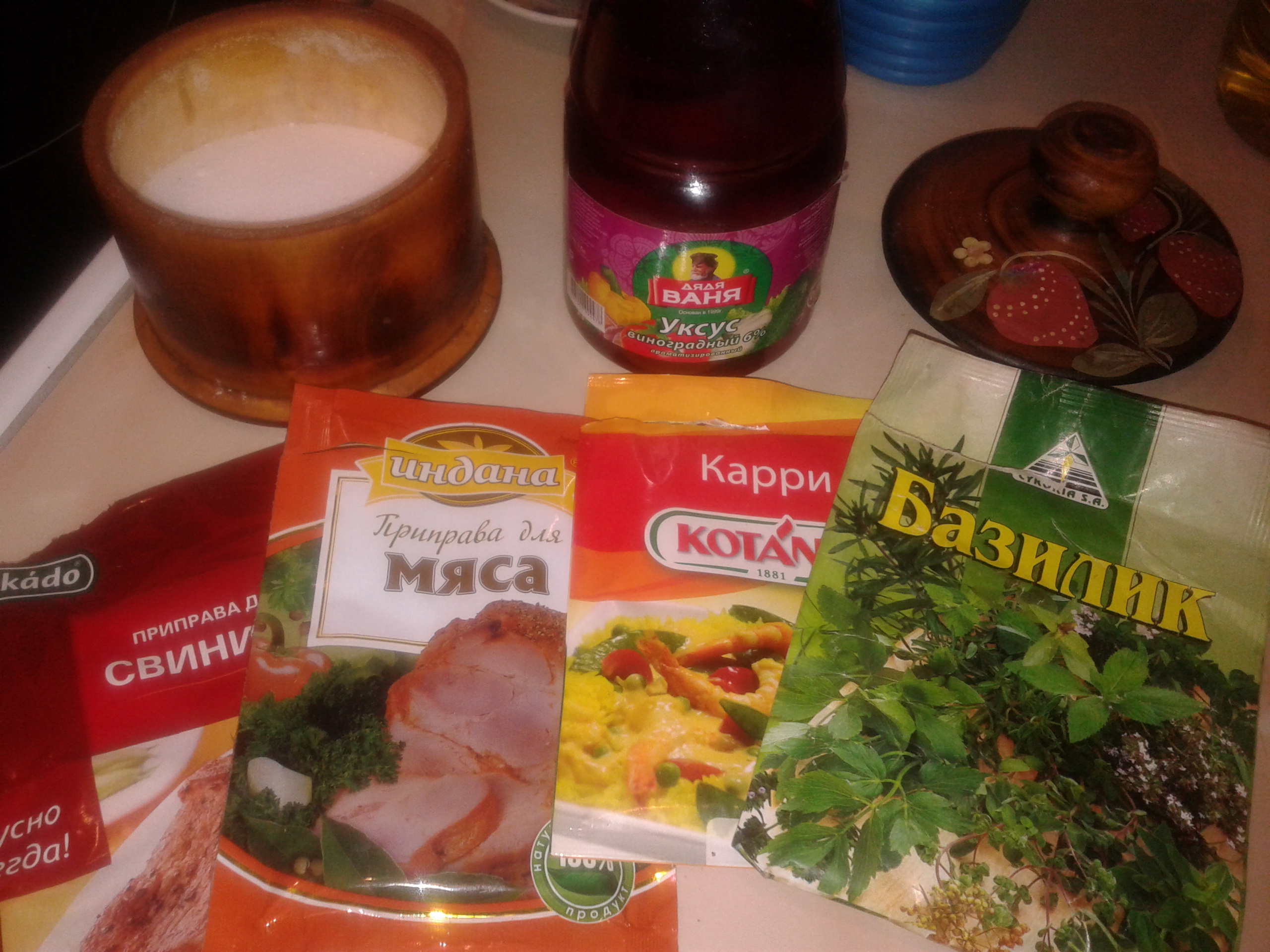 значит потрошеная тушка отмачивалась часа 3 в виноградном уксусе, затем срезала с птицы большие участки мяса,в основном с грудки, и уже кусочки филе замариновала в приправах