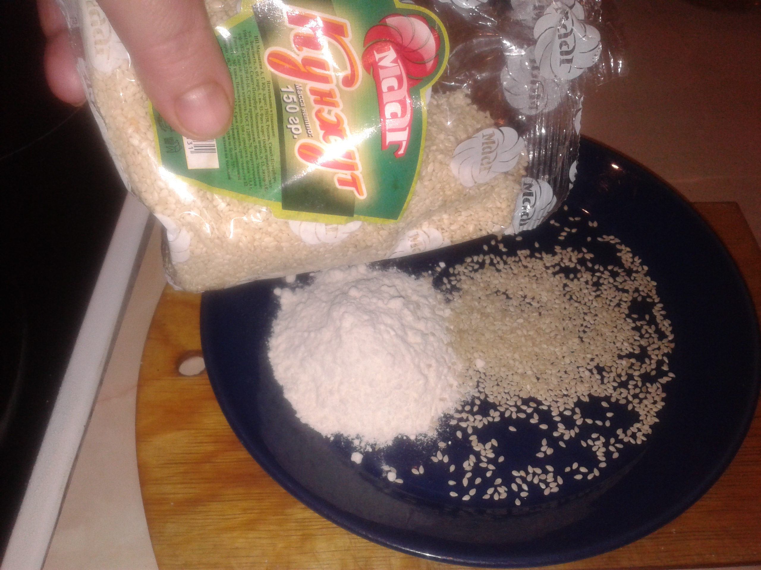 отбитое мясо обваливаем в муке перемешанной с кунжутом!