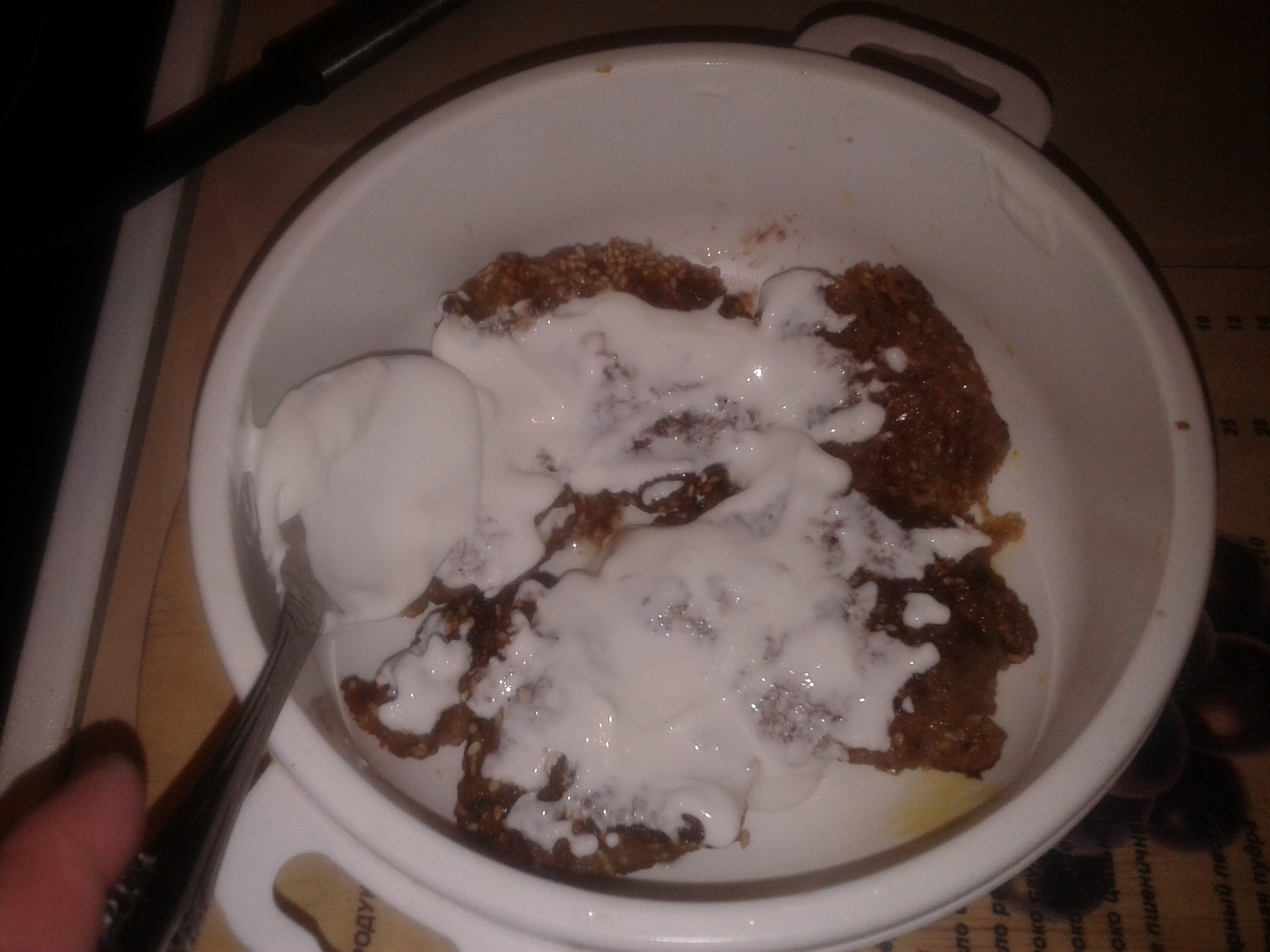 Затем кусочки укладываю в кастрюльку для микроволновой печи,слои смазываю сметаной