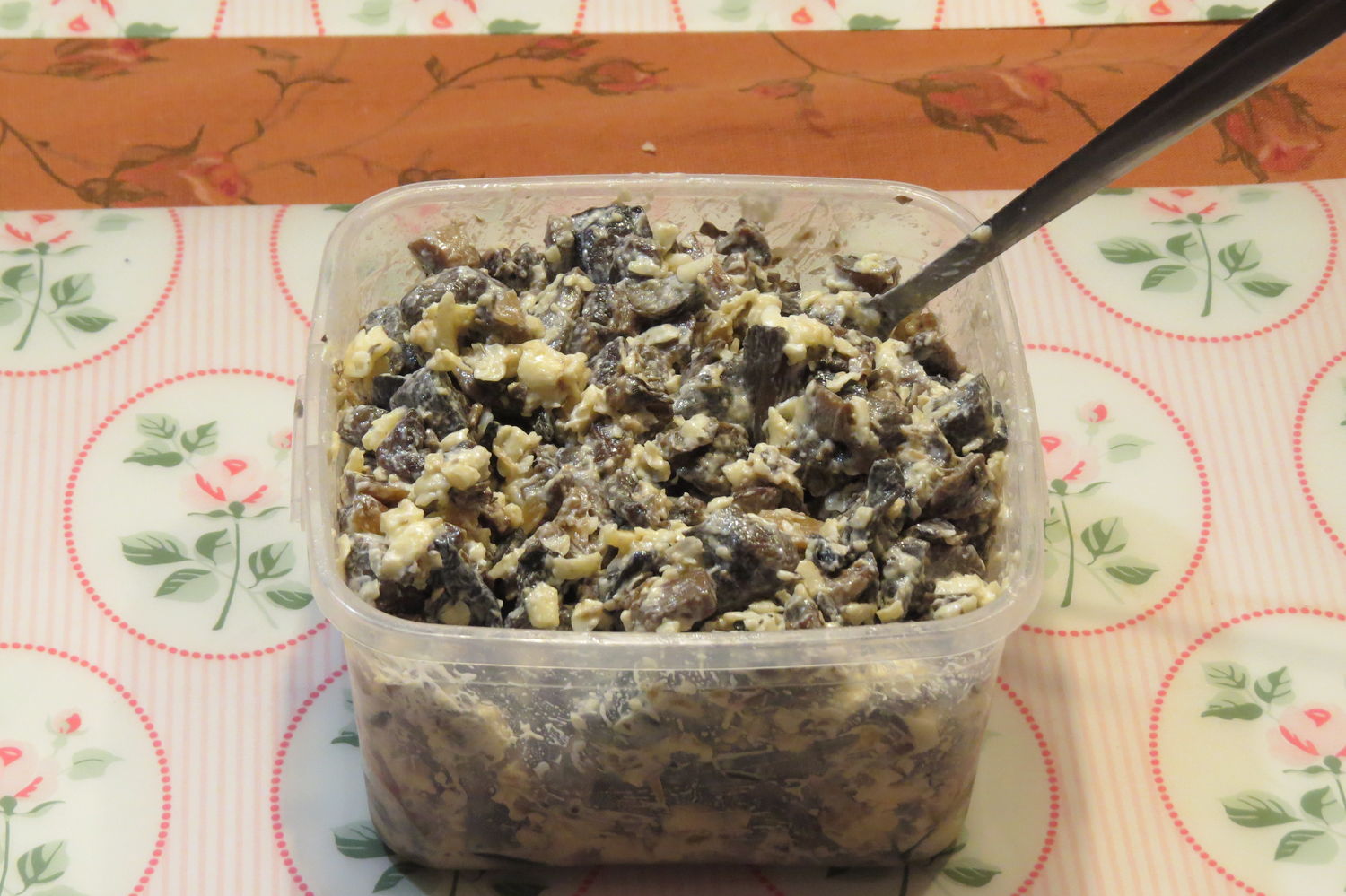 Смешиваем остывшие жаренные грибы с натертым сыром с чесноком. Сыр с чесноком предварительно смешиваем со сметаной(2,5 ст. ложки)
