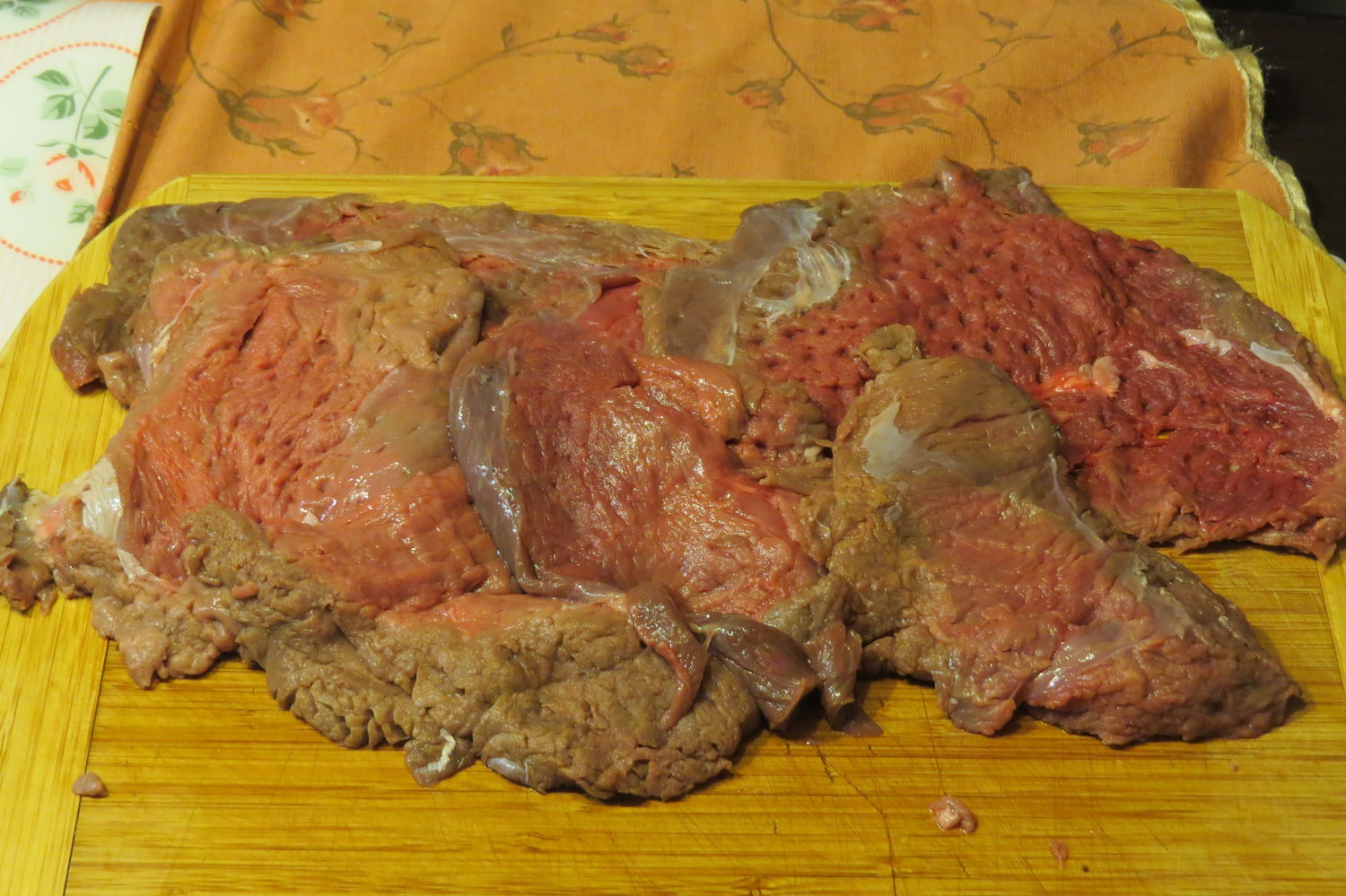 Берем мясо лося, срезаем жилки, пленочки.