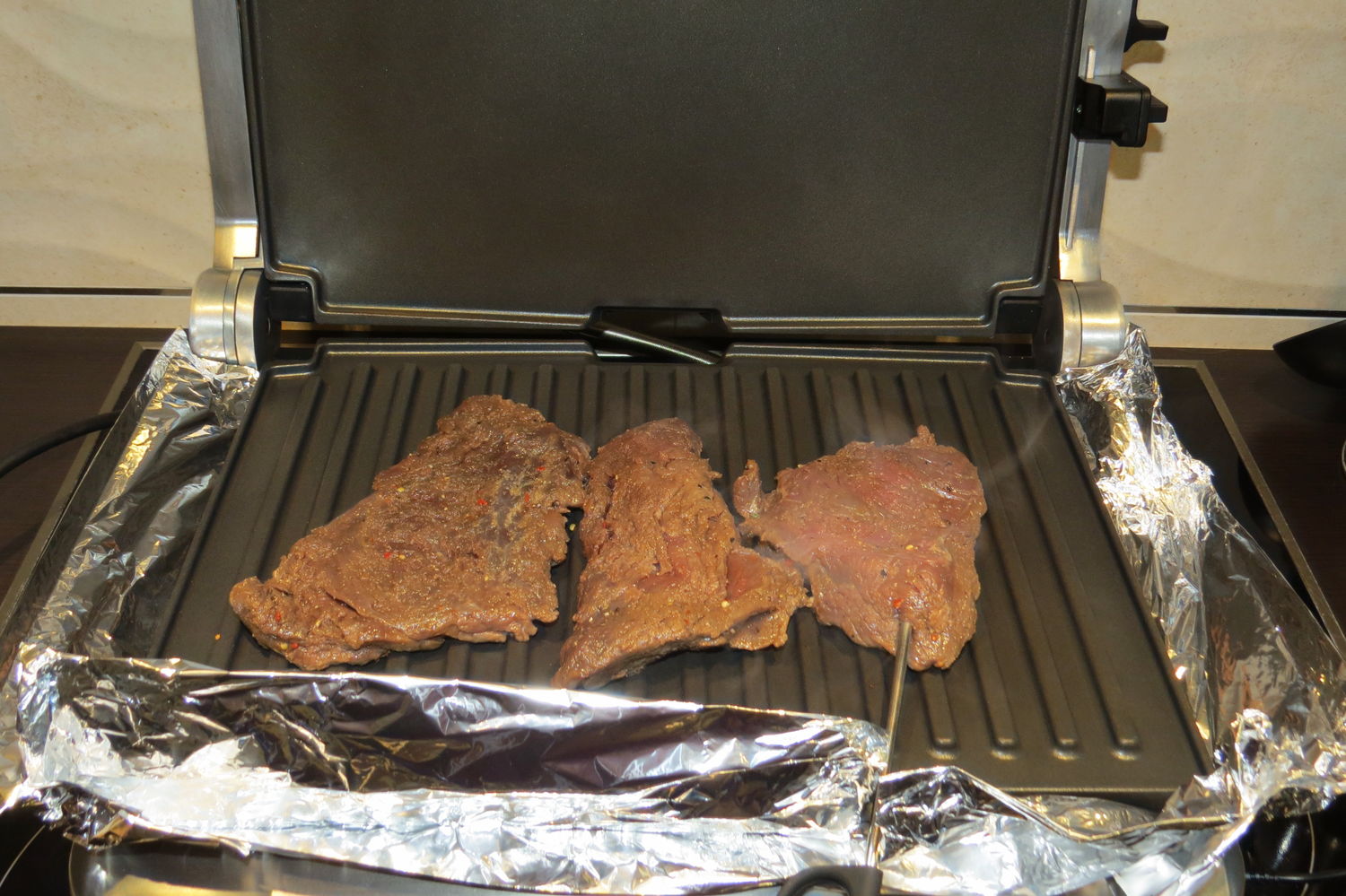 Кладем на гриль мясо. Закрываем.