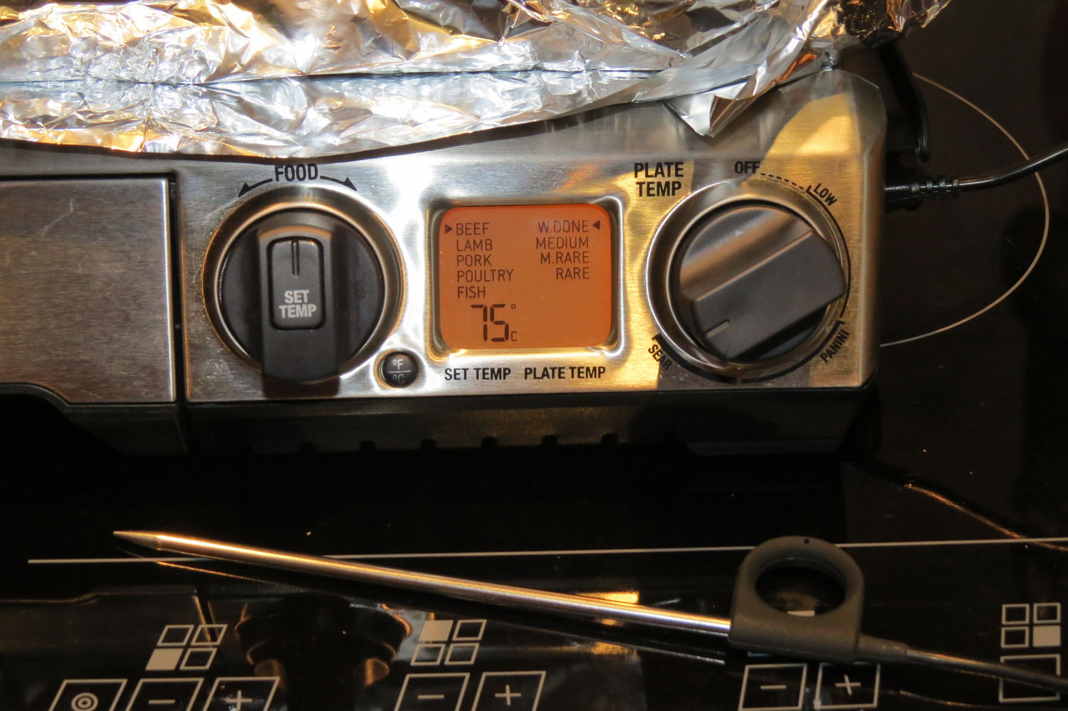 Еще я использовал термощуп, для контроля прожарки куска мяса. На сковороде определяем приготовление «на глаз»