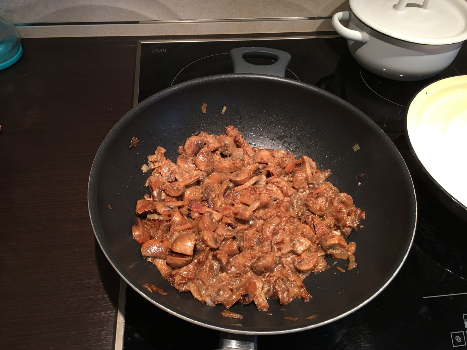 Жарим грибы с луком в сковороде. Когда грибы прожарятся и будут готовы, выключаем конфорку и добавляем в грибы сметану. Перемешиваем и оставляем остывать. Потом блендером измельчаем грибы. Отживаем руками в дуршлаге лишнюю воду из натертого картофеля. Добавляем в него яйцо, специи, муку и грибы.
