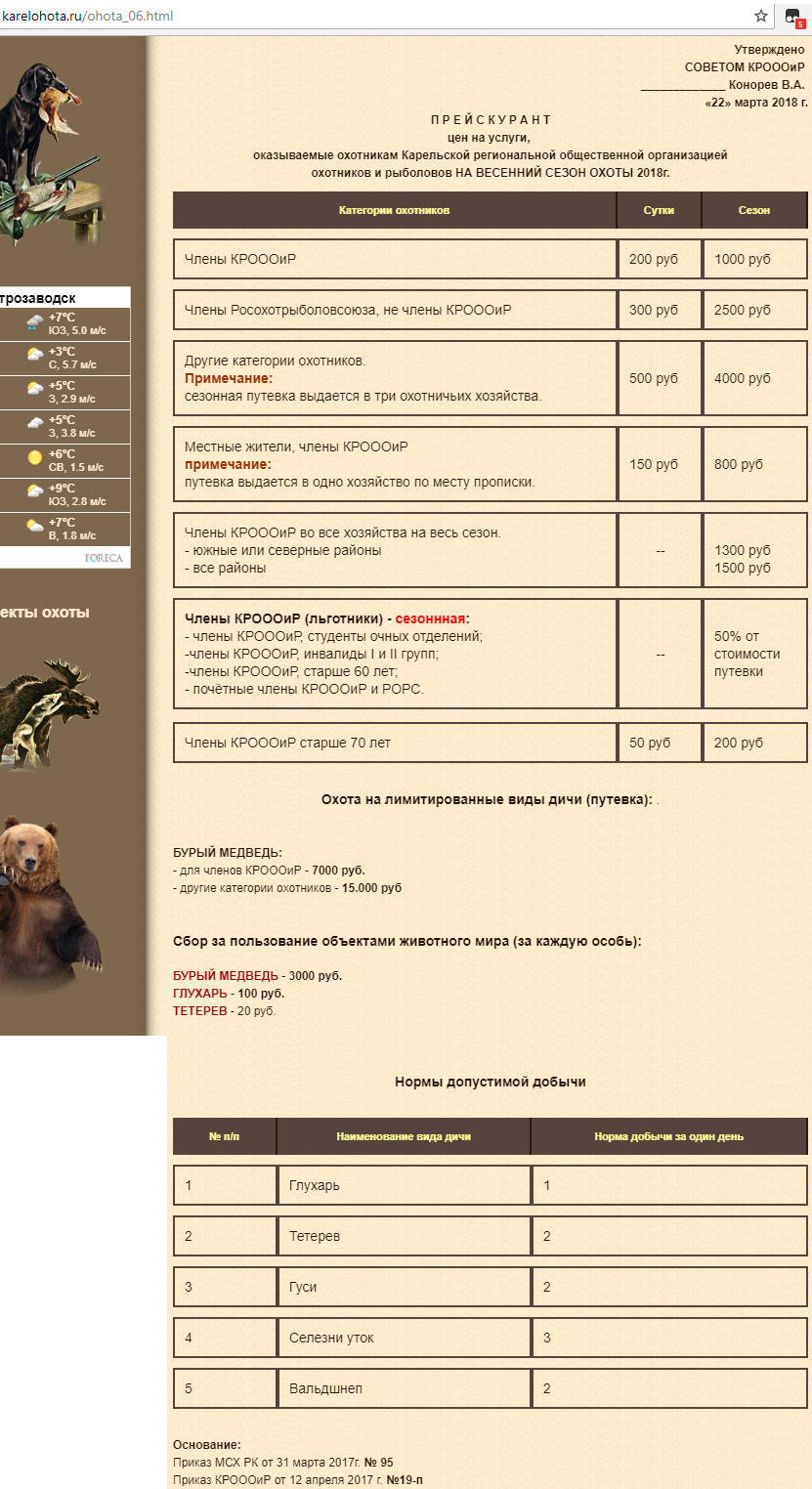 П Р Е Й С К У Р А Н Т цен на услуги, оказываемые охотникам Карельской региональной общественной организацией охотников и рыболовов