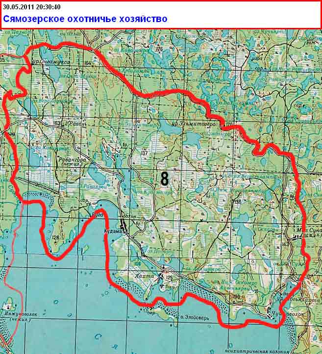С востока: по р. Малая Суна до пересечения с грунтовой дорогой в квартале 19 Сяпсинского лесничества.