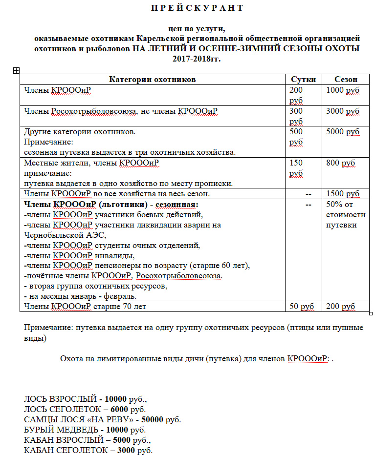 Осень-зима 2017-2018. Прейскурант на охоту КРОООиР.