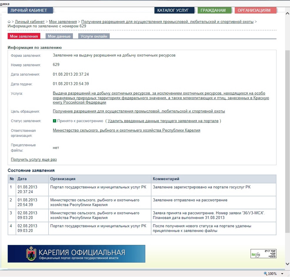 1. Распределение разрешений на добычу охотничьих ресурсов между физическими лицами осуществляется органом исполнительной власти Республики Карелия, уполномоченным в области охраны и использования объектов животного мира (далее - уполномоченный орган), на основании поданных ими заявлений. «на выдачу разрешений на добычу охотничьих ресурсов»;
