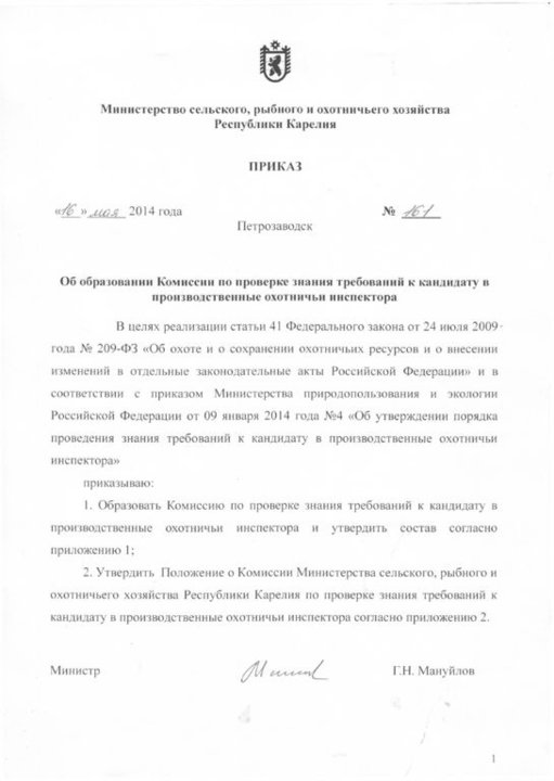 16 мая 2014 года в Министерстве сельского, рыбного и охотничьего хозяйства Республики Карелия образована комиссия по проверке знания и утверждено положение о комиссии.