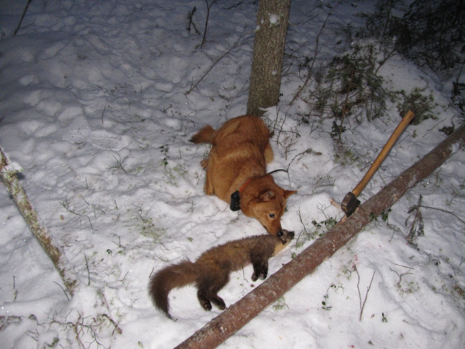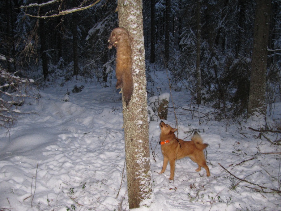 Ну а дальше началось самое интересное. Снегу наверху мало, поэтому куница летела вЕрхом гораздо быстее, чем я бегаю по пересеченой местности :-): . Только по падающему впереди снегу и лаю Умы и можно было определить направление. Ну а останавливалась она в таких ёлках! Метров почти 30 в высоту, а вершины настолько пушистые, что просмотреть абсолютно невозможно. И сидела очень крепко, старгивалась дальше только с помощью колота. В ходе этой погони быстро выяснилось, что Ума следит верх гораздо лучше меня. При одной из остановок у нас с ней возникло разногласие: я последний раз видел зверька на одной из огромных елей, а Ума лаяла на такую же ель в 20м впереди. В итоге права она оказалась, куница пошла дальше, пока я перетаскивал колот от одного дерева к другому. Так что куница трудовая, добыли уже в сумерках. А особенно радует то, что собаке всего 13 месяцев, и это её первая куница. Настроение такое, как будто сам первого зверька добыл!