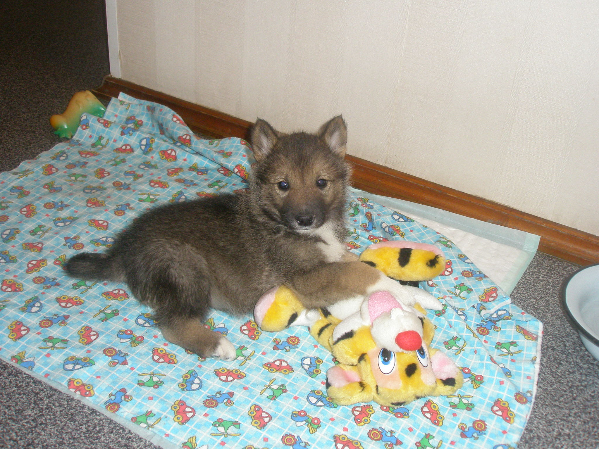 щенку месяц и 4 дня.Дома уже освоилась,бойкая.мягкого мишку трепет мотает во все стороны :-):