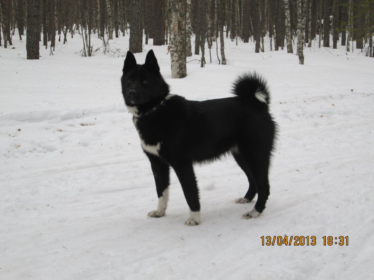 Сука - РЕЛ, возраст 1,5 года, окрас черный с белыми пятнами на шее, груди, лапах, кончике хвоста.