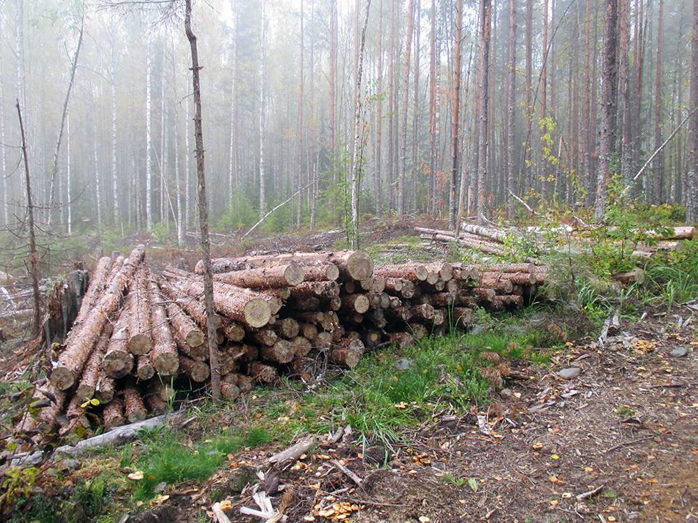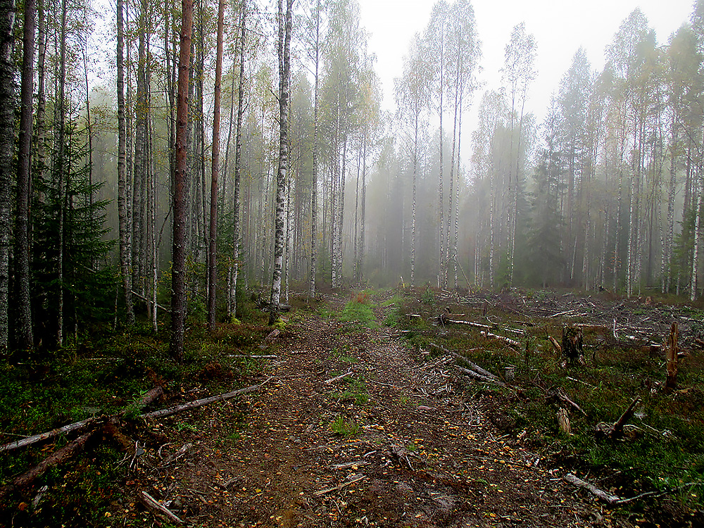 Переехал на достаточно свежий лесовозный ус, и не спеша пошел изучать окрестности. Утро то моросит крупными каплями дождика, то напускает тумана. Лесная дорожка манит. А остатки не вывезенного в прошлом году леса расстраивают.