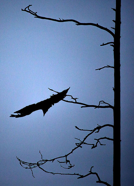 Встреча с Вороном, прошла бы незаметно, если бы не дистанция между автомобилями. Первые остановились и ждут. Просто так ждать не интересно. Особенно, когда прямо над автомобилем на старом сухом дереве сидит гордая птица. Достали фотокамеру и хотели сделать особенные кадры. Но Ворон быстро показал свою спину и дважды сердито перевернулся в воздухе, как будто что-то хотел сказать...
