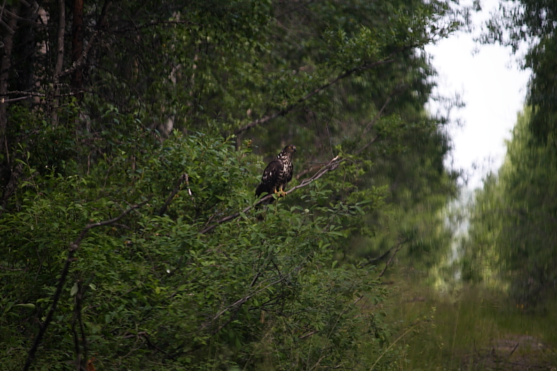 А вот когда поехали обратно, то примерно на этом же месте сидел ястреб. Этот позировал до последнего, несколько раз перелетал с одной стороны дороги на другую, садился и косил своим глазом на нас.