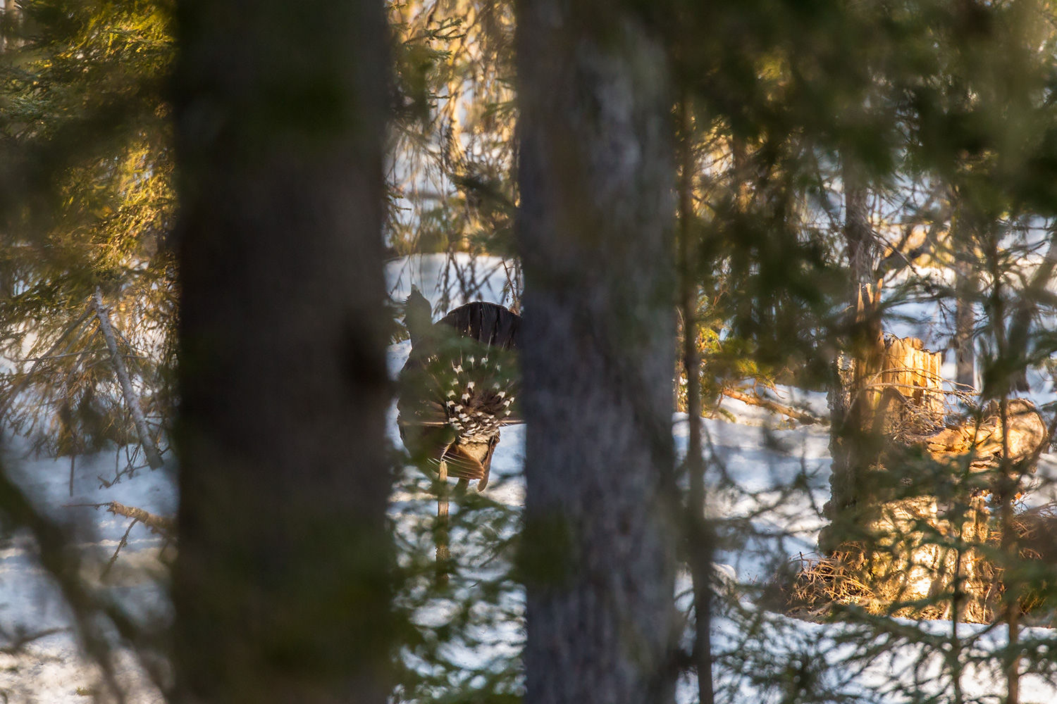Поет в чаще. Тропинку топчет 10 метров в одну сторону, 10 обратно. На опушке сидит самочка, ждет, кудахчет. А он проявляет характер. Лишь поет громче и прыгает активней, но сам к девочке не идет. И на открытое место не выскакивает. Может быть просто глухарь-трусишка?