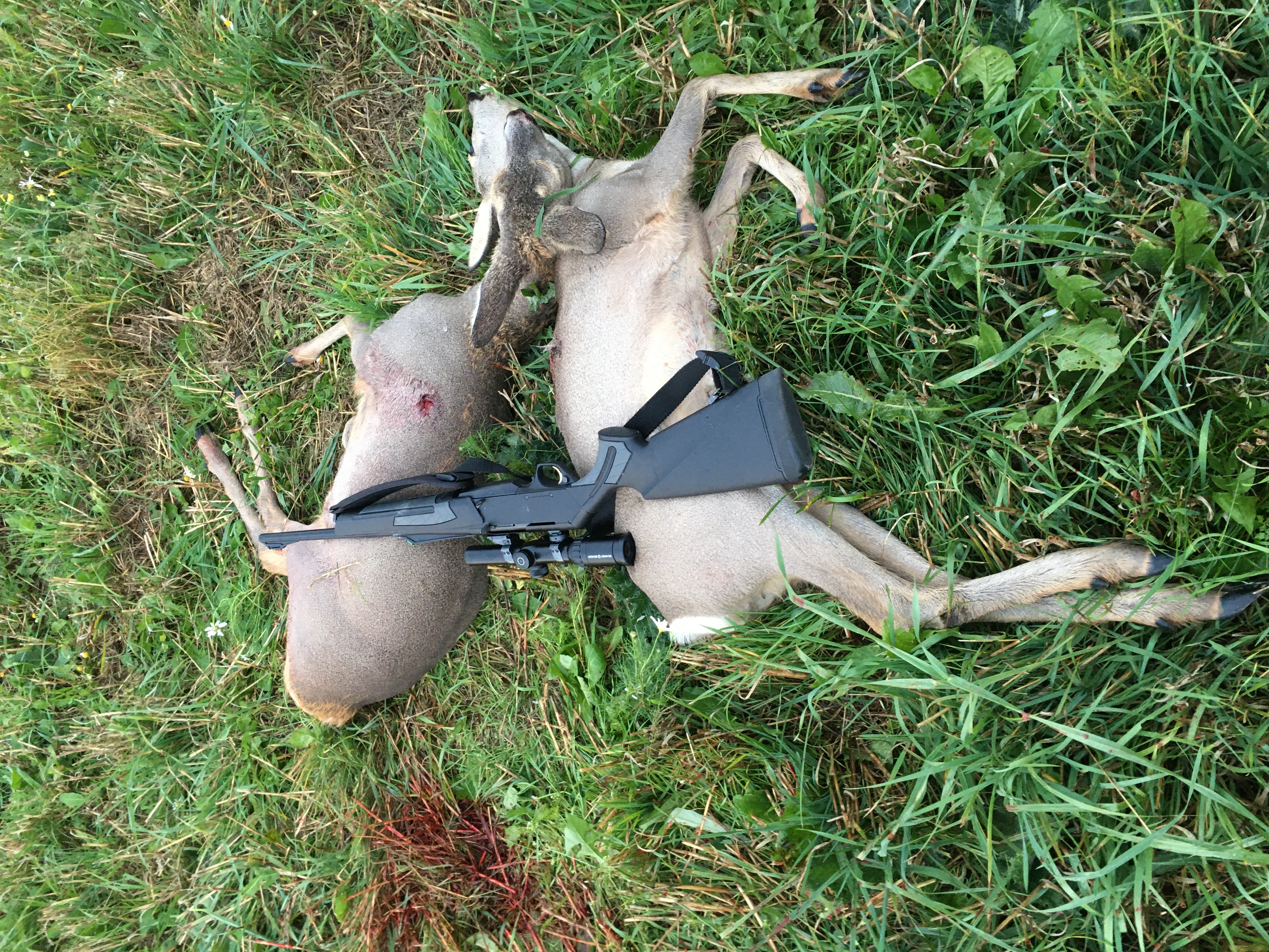 Когда все загонщики вышли на дорогу к номерам, дана команда окончить охоту. Идем к стрелку. Зверь добыт. Вышел зверь очень тихо, через заросли кустарника, прямо на номер в 20ти метрах. Вышел в штык, увидев охотника зверь начал разворачиваться, в этот момент и был добыт. Попадание в основание шеи, калибр 9,3х62. Бык лег сразу, прямо у дороги.