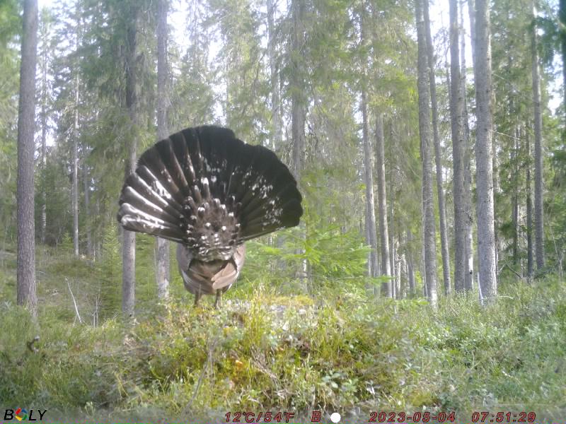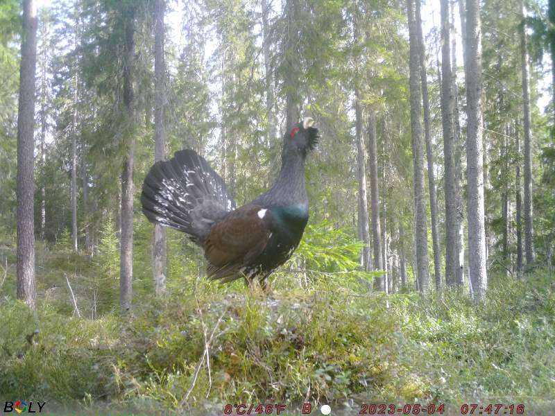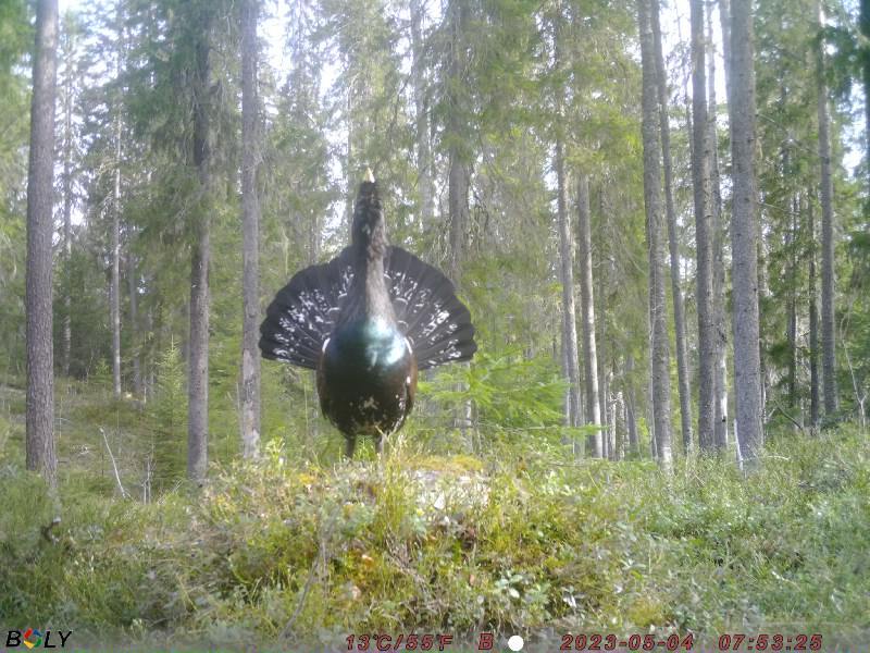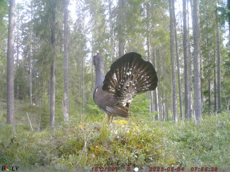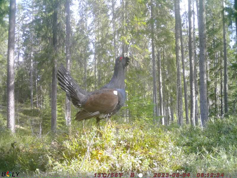 Нашли пень, на котором был явно токовой помет глухаря разного периода. С учетом освещенности и ракурса, установили лесную фотокамеру с расчетом, чтобы глухарь в случае прилета на пень был в правильной композиции - как на трибуне.