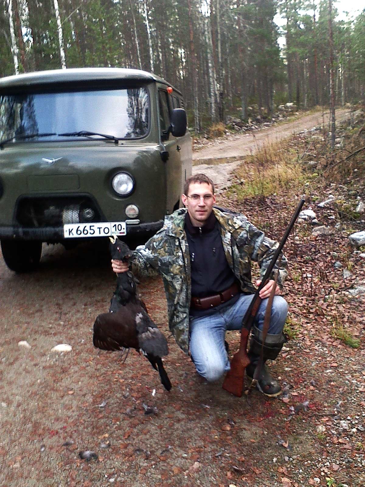 на самом деле есть разумное объяснение человек добыл глухаря, ехал обратно, вспомнил что у него есть фотик и существует наш форум, остановился у какого нибудь пня (на который можно фотик поставить, собакен в машине )