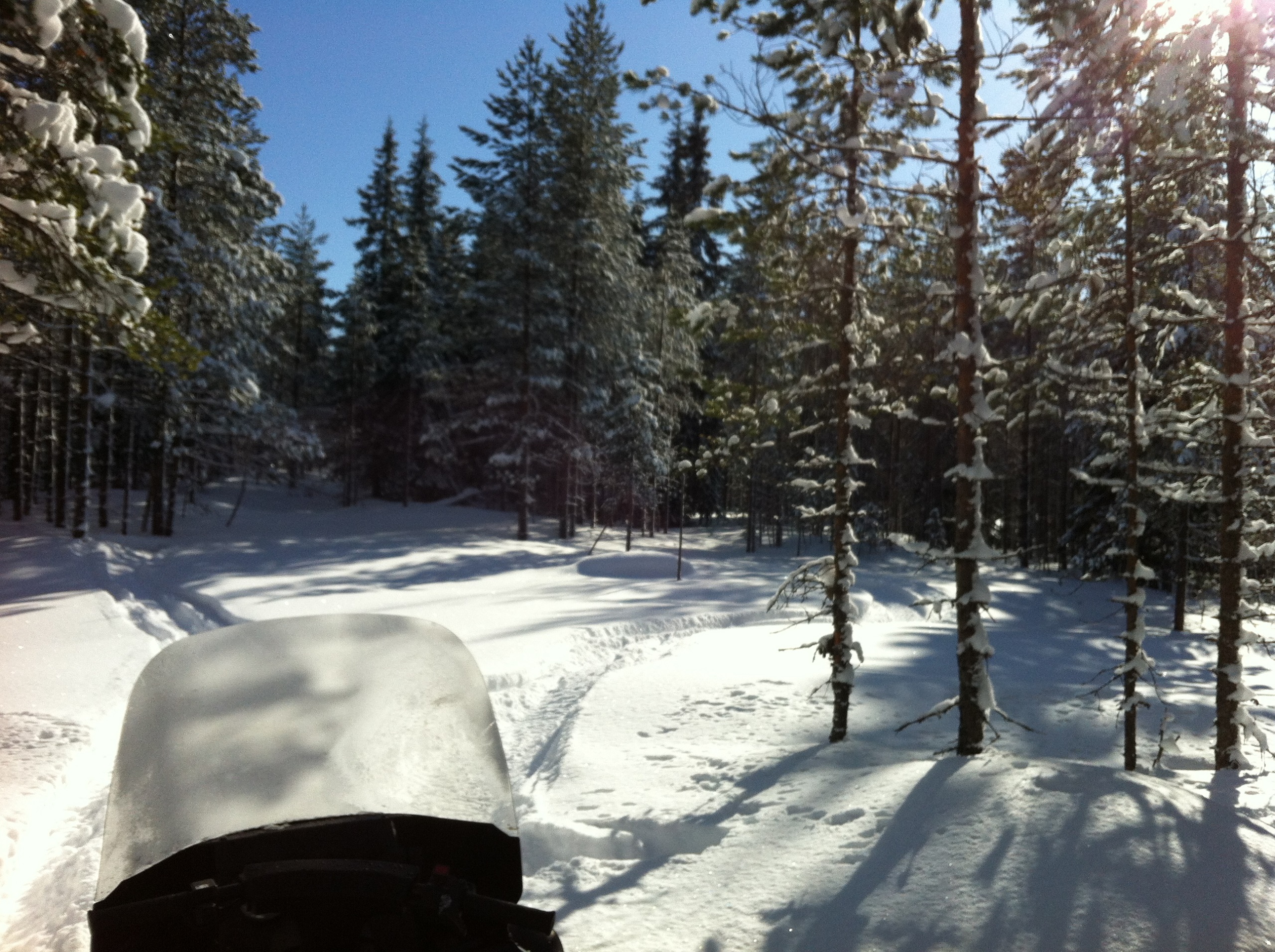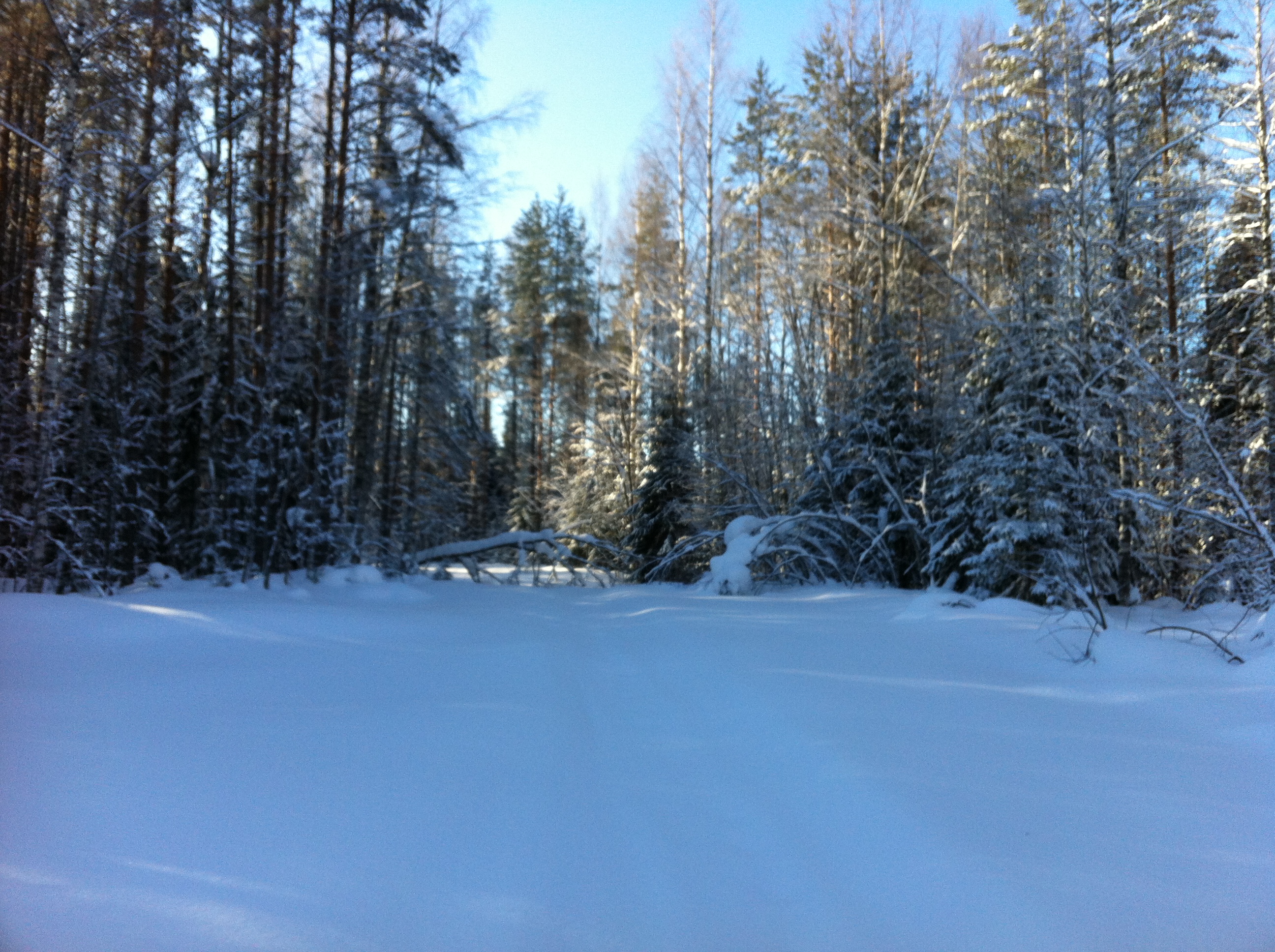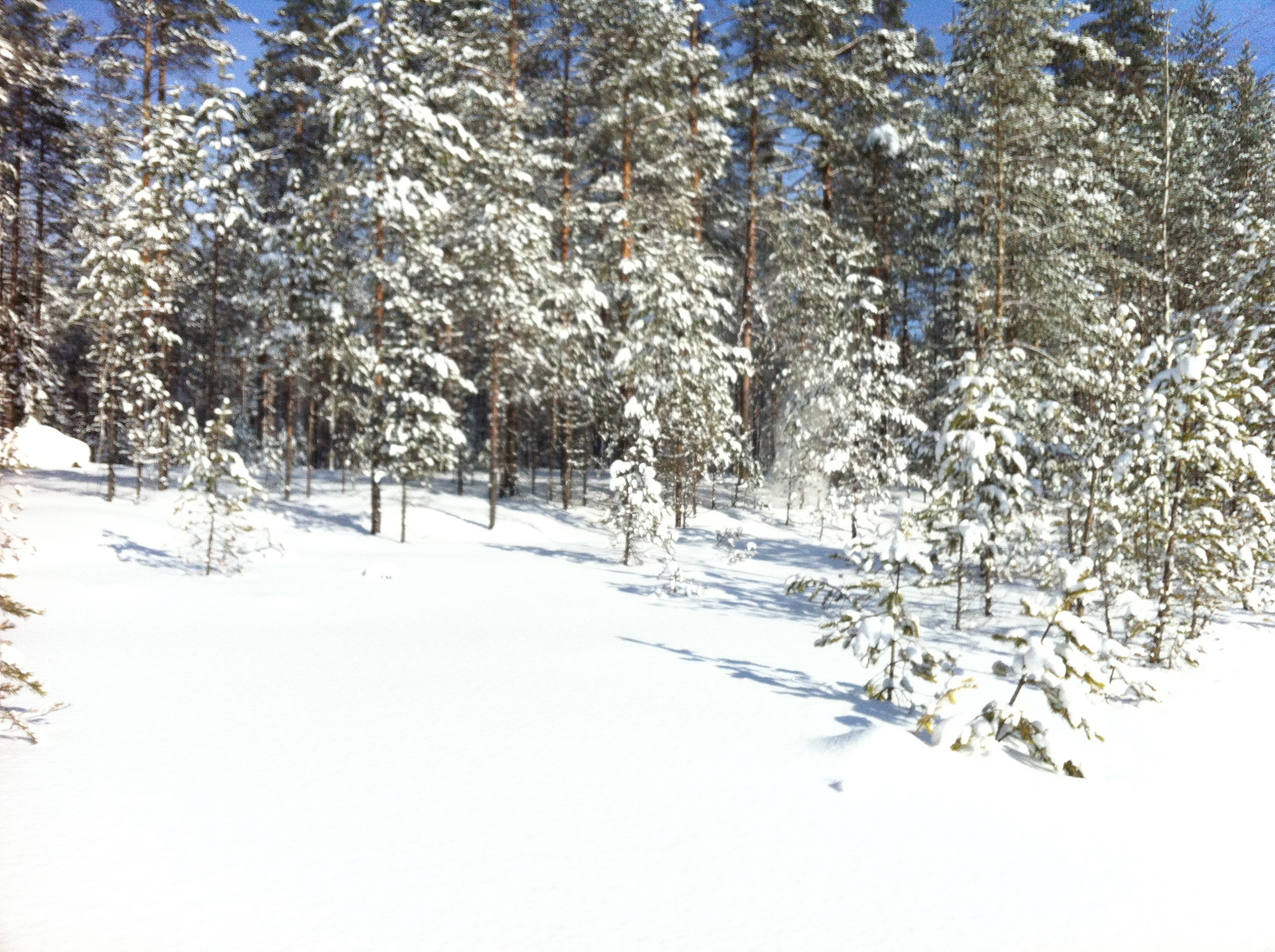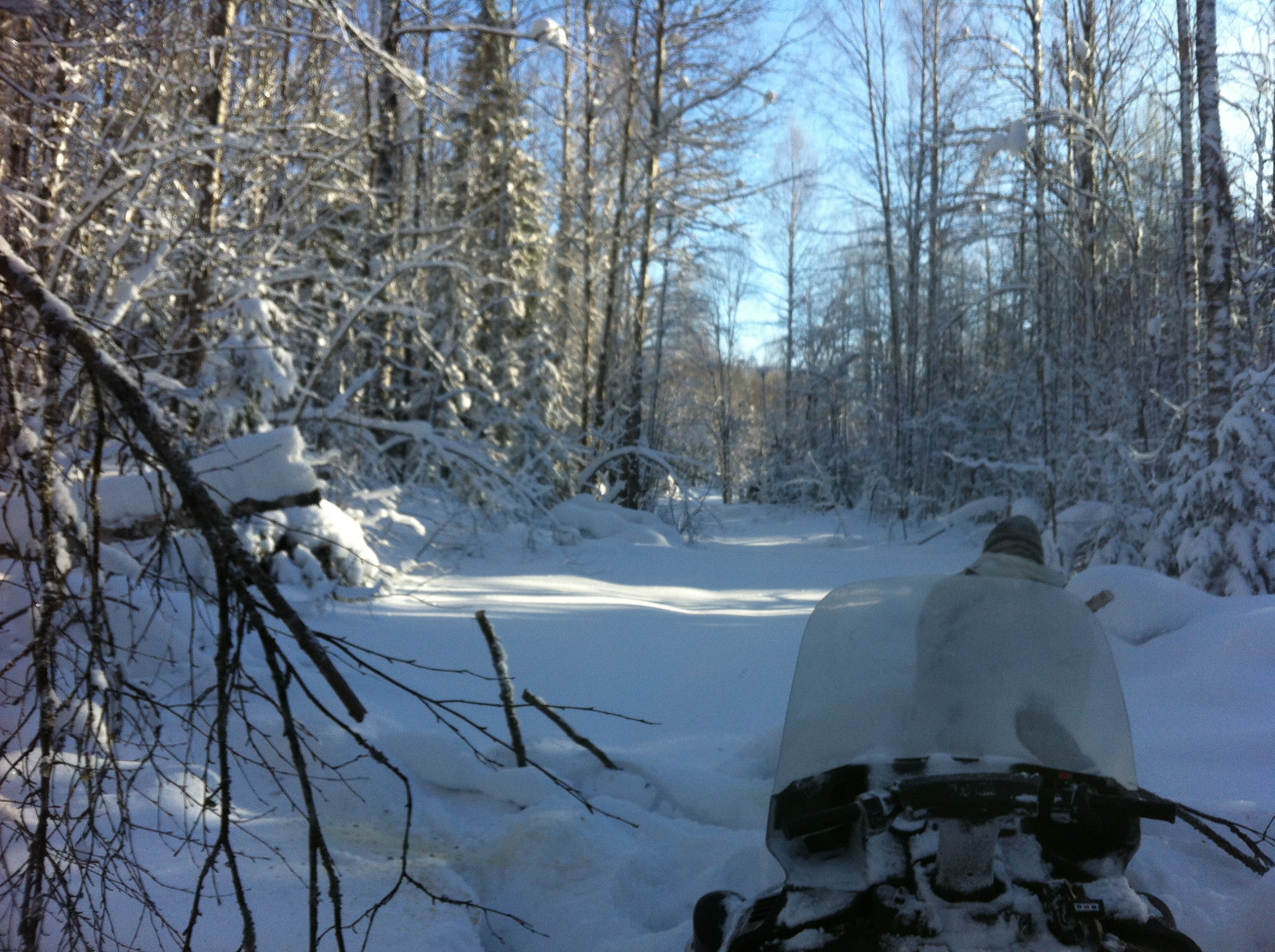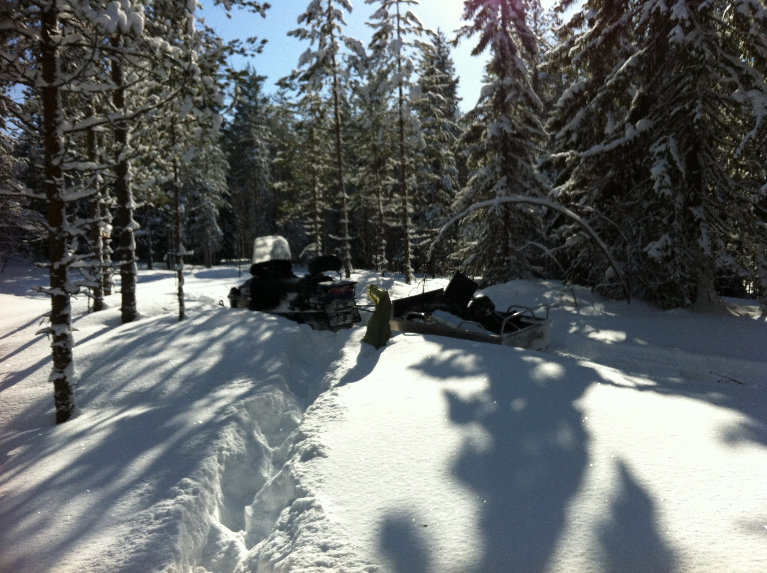 Ну вот, мы на нашей технике подъехали к началу путика, решили сделать остановку и попить чайку. Как же вкусен горячий чай с не хитрым бутербродом, на морозце в чистом карельском лесу!!! Снега в лесу очень, очень много. Слезаешь со снегохода и проваливаешься, без преувеличения по пояс! Чистить путь было нелегко, проваливаясь пока доползешь, что бы ветровалины убрать вспотеешь, как хрен знает кто. В общем, в лесу только на лыжах или снегоступах.Мороз стоял, где то минус 20,снег был рыхлым и пухлым, снеж шел тяжело, поэтому приняли решение расцепить сани и продолжать движение вдвоем, а еще двоих оставить с санями и ждать нас, пробьем путь- вернемся за санями. Пробив путик, мы вернулись, зацепили сани и поехали на нашу стоянку, доехав до озера, перед нами предстали просторы зимнего леса и озера, освещенная солнцем природа завораживала!