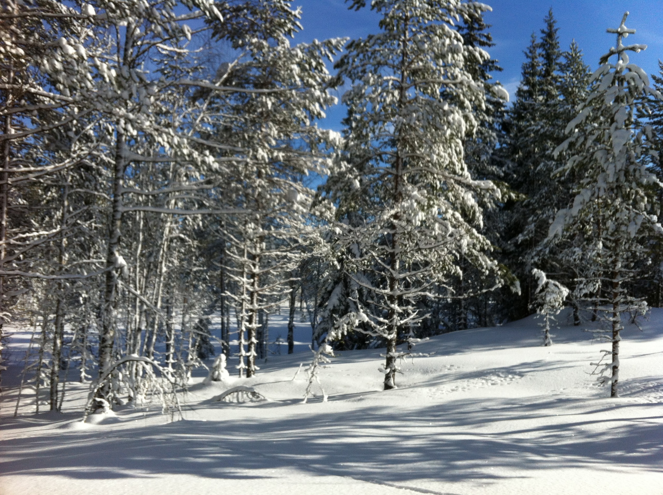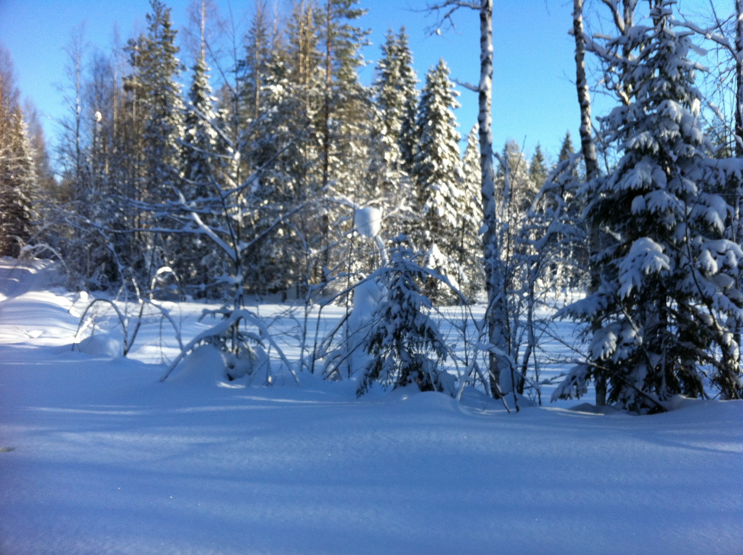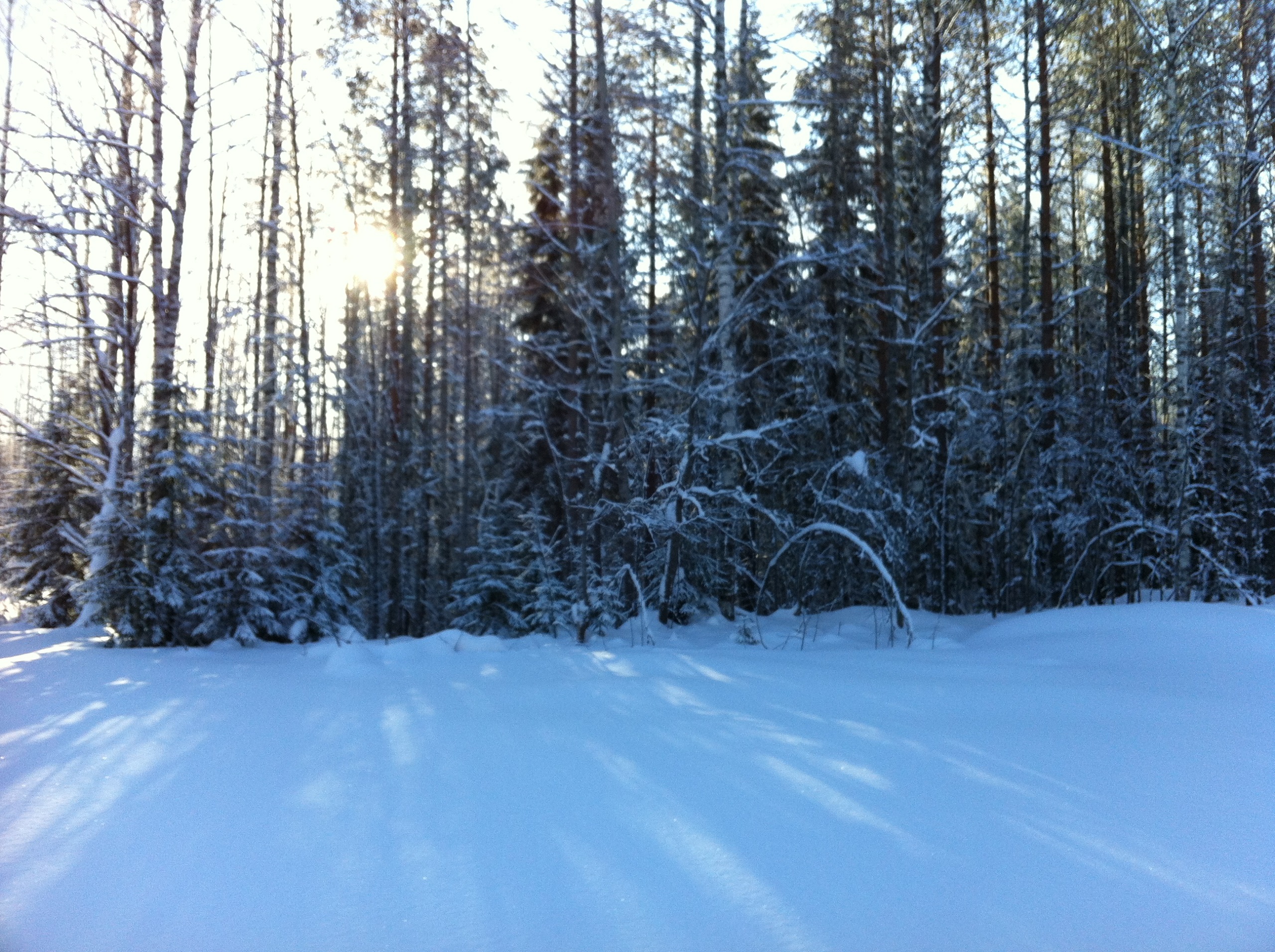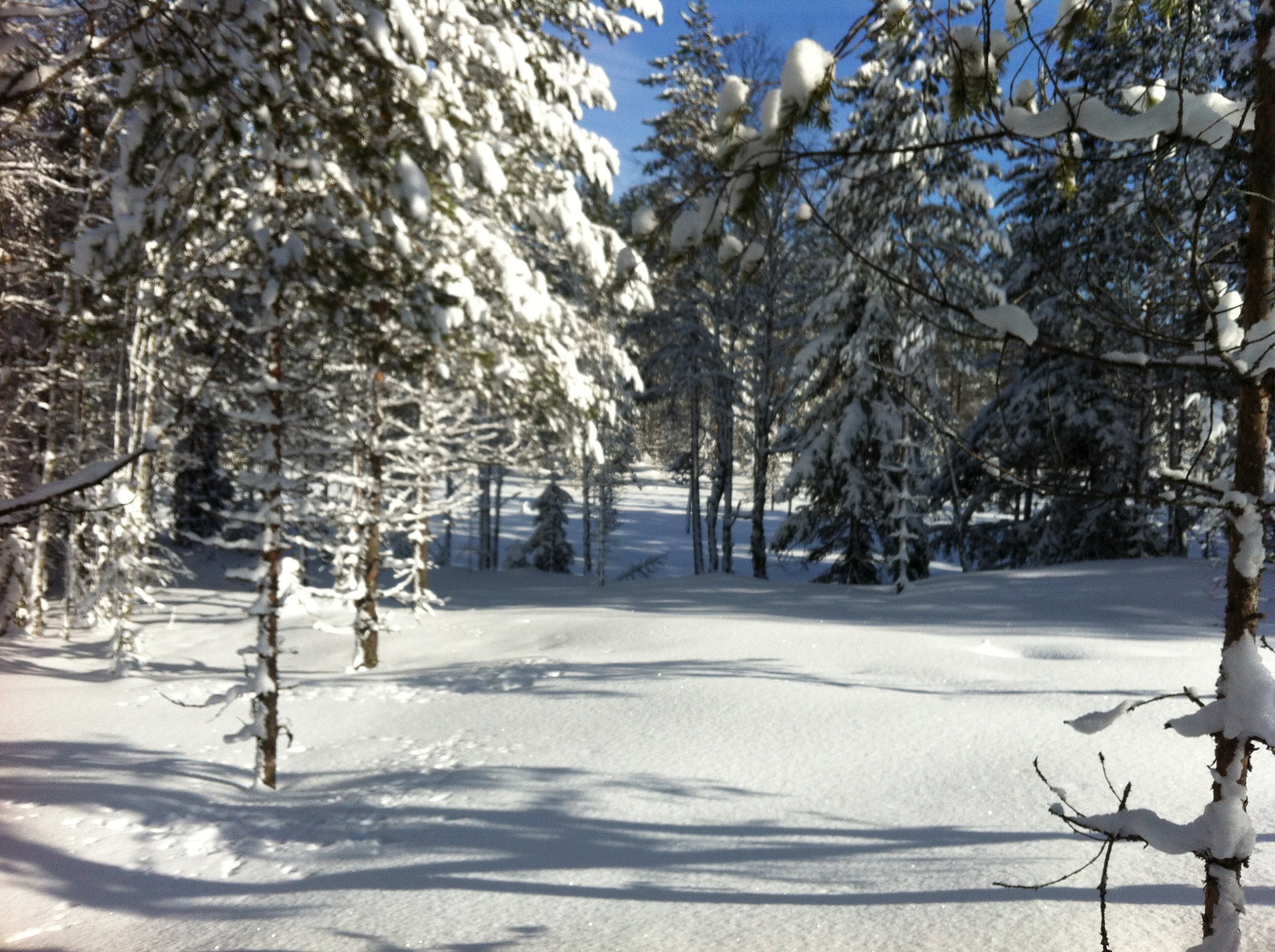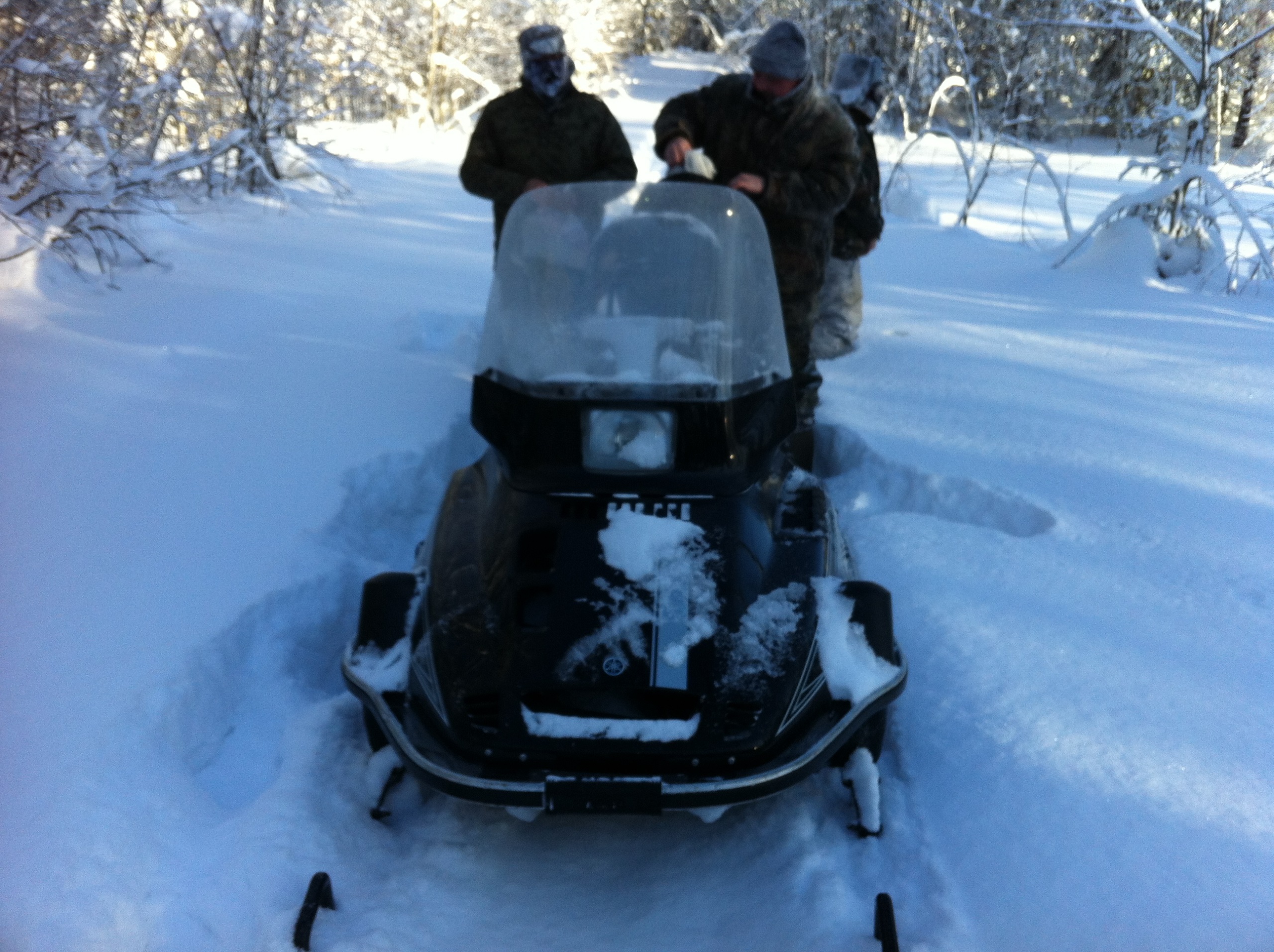 Ну вот, мы на нашей технике подъехали к началу путика, решили сделать остановку и попить чайку. Как же вкусен горячий чай с не хитрым бутербродом, на морозце в чистом карельском лесу!!! Снега в лесу очень, очень много. Слезаешь со снегохода и проваливаешься, без преувеличения по пояс! Чистить путь было нелегко, проваливаясь пока доползешь, что бы ветровалины убрать вспотеешь, как хрен знает кто. В общем, в лесу только на лыжах или снегоступах.Мороз стоял, где то минус 20,снег был рыхлым и пухлым, снеж шел тяжело, поэтому приняли решение расцепить сани и продолжать движение вдвоем, а еще двоих оставить с санями и ждать нас, пробьем путь- вернемся за санями. Пробив путик, мы вернулись, зацепили сани и поехали на нашу стоянку, доехав до озера, перед нами предстали просторы зимнего леса и озера, освещенная солнцем природа завораживала!