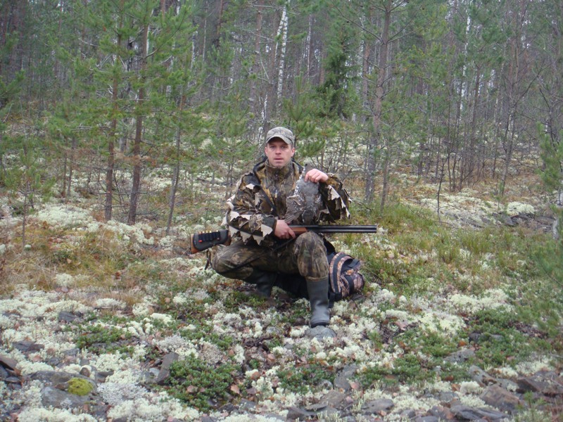В воскресенье тоже побывал в лесу. Правда с погодой не повезло. Небо пасмурное, светать стало только к 10 утра. Да к тому же еще и ветер был сильный, рябчик молчит, все больше на земле сидит. На манок практически не летел. Одного все же удалось добыть. Минут сорок он мне «мозг выносил». Я уж было плюнул на него - сел перекусить. Только я скинул рюкзак, достал термосок с горячим чаем и бутербродами, а рябой перелетел, сел в густой ельник метрах в двадцати от меня, и сидит, чирикает что-то на своем! Перекличка между нами продолжалась минут 30-40. Я уже и чай весь выпил, и продрогнуть успел до мозга костей, подумывал оставить его в покое. И, наконец-то случилось чудо! Мой "собеседник" сменил место дислокации, расположившись на сухой сосне, аккурат в двадцати шагах от меня. Вот тут то я и припомнил ему все его издевательства над моей личностью !!!