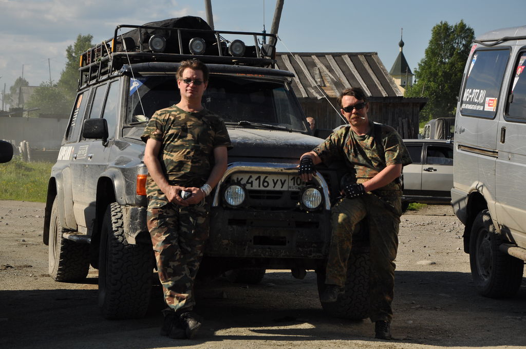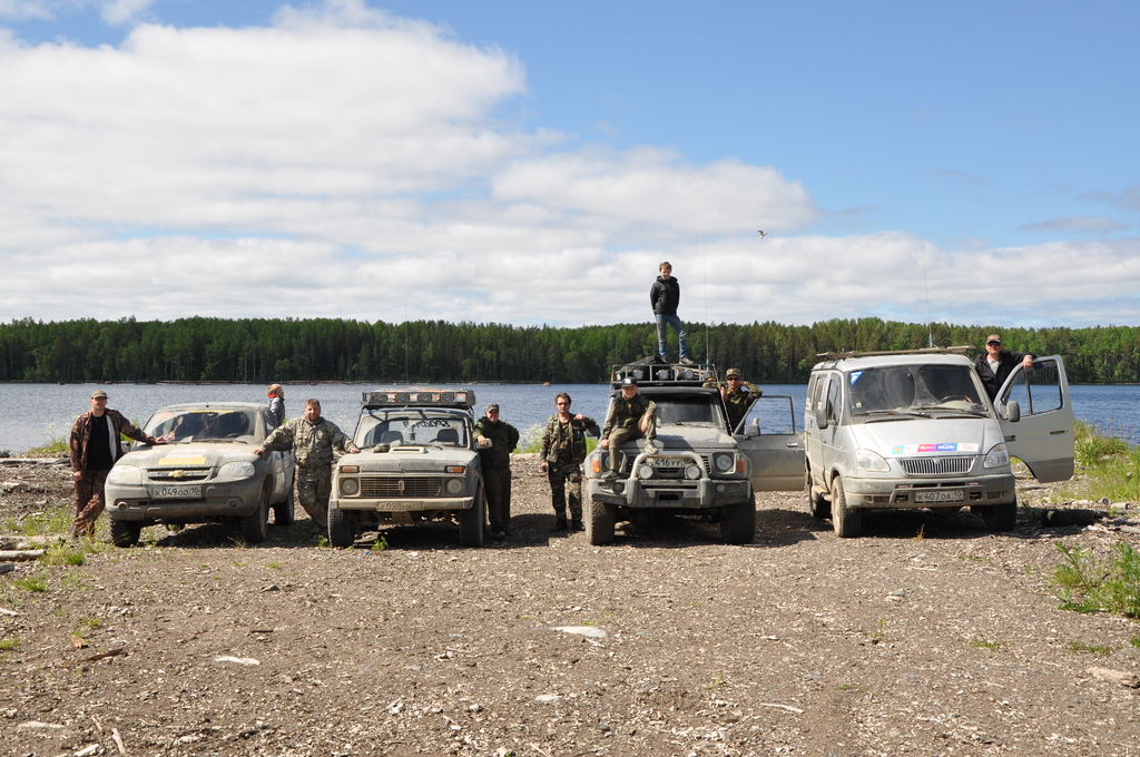 Вот тут то и наступило разочарование. Перед нами открылась панорама острова, и даже была видна одна из церквей, НО!, стоянки небыло!!! Довольно сырое место, палатки поставить негде, в право уходила ТРОПА с колеей. Разведка сообщила "Метров через 80, болото, встать негде." Загонять Патруля, небыло смысла, если бы даже, я и проехал и добрался бы до Боярщины... остальные бы не проехали, да и мне возвращаться было бы тяжко (лебедки пока нет). Поэто сфоткались и выдвинулись в район деревень Нижняя Салми - Южный Двор. В нижней и заночевали, стояли там две ночи.