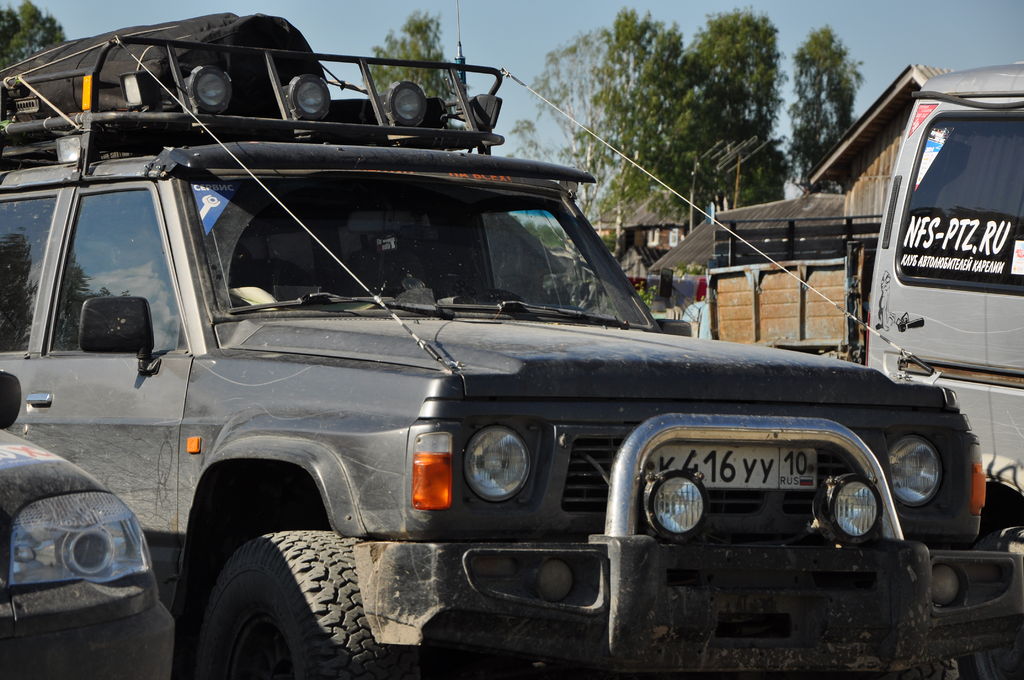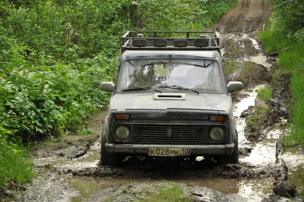 Мы выбрали №3. Ехать по асфальту на внедорожниках... не спортивно и не интересно. Если ехать от Кондопоги в сторону Кеппясельги, действительно, упрешся в перекопанный переезд через Ж/Д пути... Поэтому надо сворачивать на право раньше, на весьма неприметную отворотку, которая вобщем то заканчивается тупиком. В лес ведет некое подобие дороги, заросшее травой, кустами и прочими прелестями. Местная шишига туда не поехала. Высланная нами разведка сообщила "Пройдем!". К стати, когда обратно разведка возвращалась, на тропе обнаружила следы волка. Ну что ж, пройдем так пройдем. На "Баргузина" одели цепи на задние колеса и поехали. Было достаточно сухо, поэтому сильно заболоченных мест небыло. Баргузин пару раз сваливался из колеи, помощь Патруля ему не потребовалась, хватило усилий Нивы (на хорошей резине). Далее весьма приличный грейдер и лесные дороги. К вечеру (а это уже был второй день) встали лагерем на озере. Была сварена тушенка и отличная уха (рыба из этого же озера).