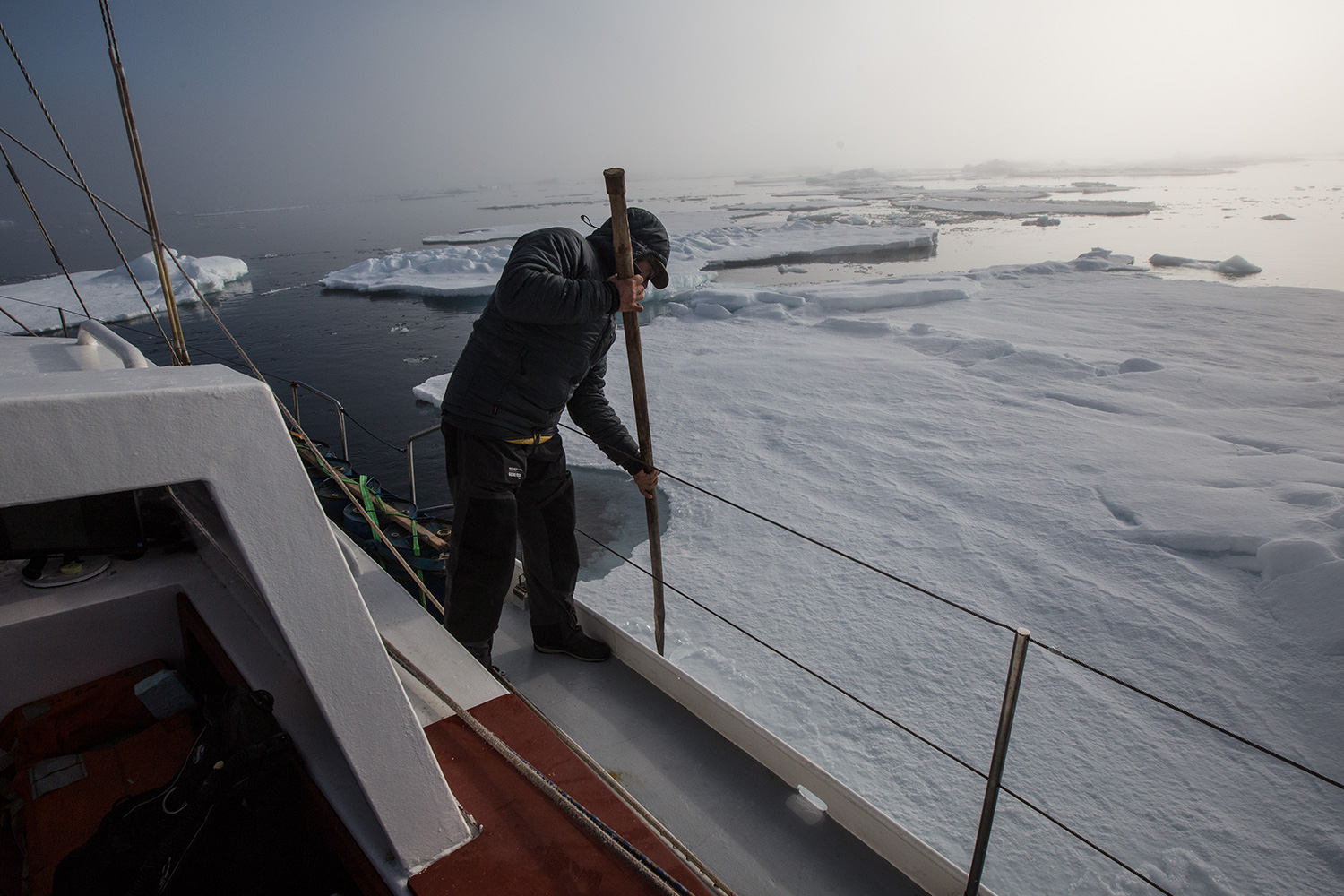Чем дальше к исторической цели нашей экспедиции - тем глубже на север. Тем чаще встречаются ледяные заторы и перемычки в проливах островов Франца-Иосифа. Неведомым образом, наша вахта с Андреем Скоровым - чаще всех попадала в ледяной плен. В такой момент яхта начинает сильно скрежетать бортами о ледышки и малые айсберги. Все это эхом разносится по каютам. Всегда первым, а иногда и единственным, на палубу поднимается капитан Михаил Тигушкин и спасает ситуацию. Без опытного капитана-полярника во льдах Арктики делать нечего. Нам в этом плане сильно повезло, а иногда нас спасало.