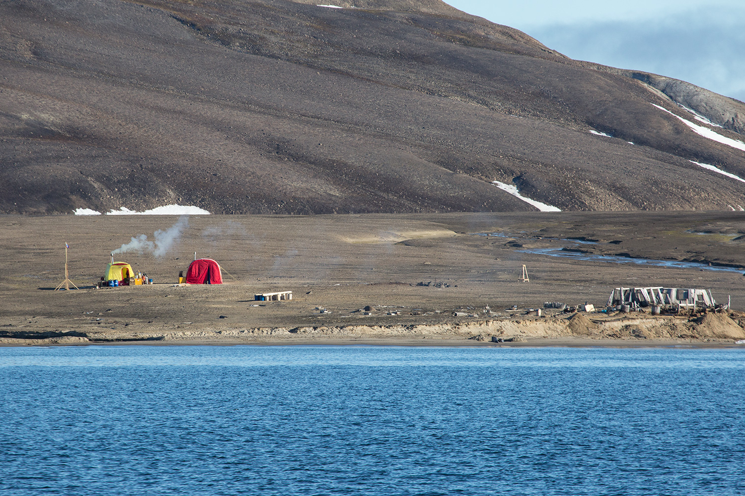 Когда уходили с острова Гукера и станции "Бухта Тихая" в сторону острова Хейса, испектор Национального парка «Русская Арктика» Андрей Кунников попросил пройти мимо острова Алжер и по рации узнать, все ли в порядке у группы археологов.