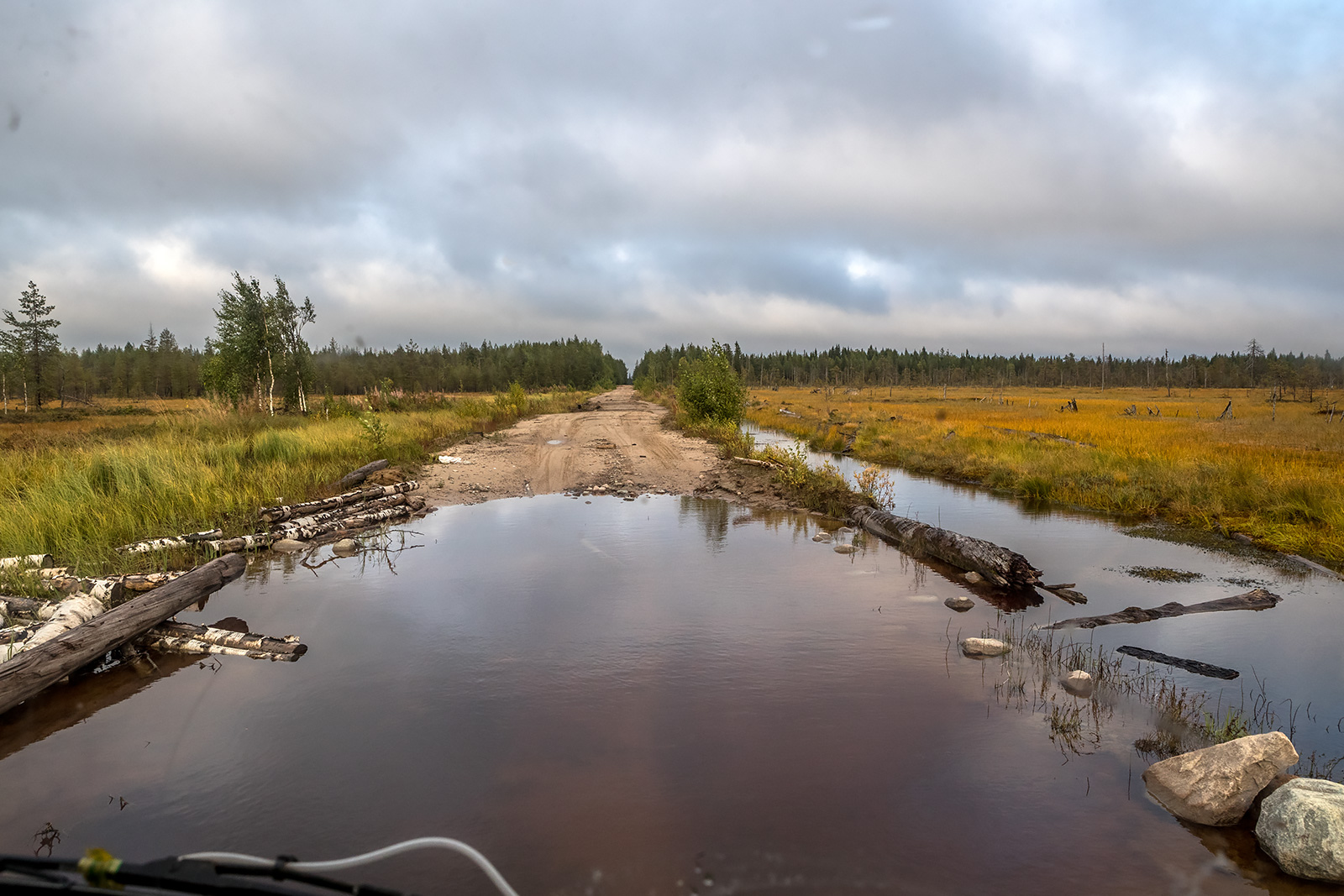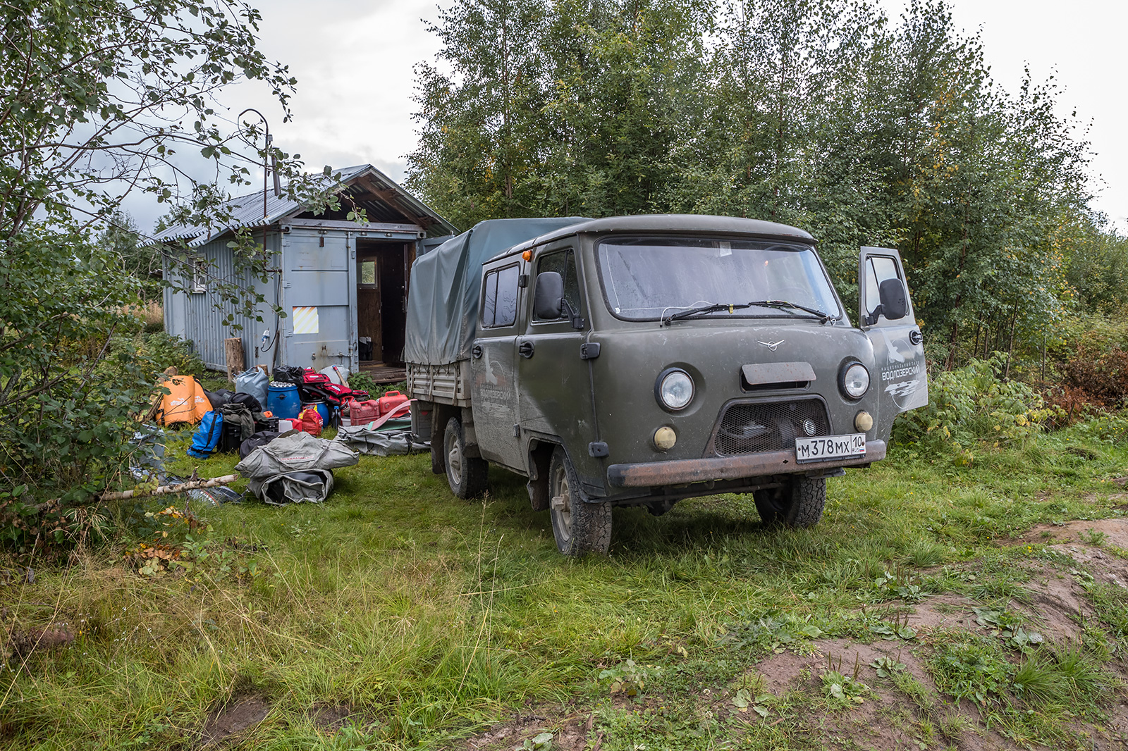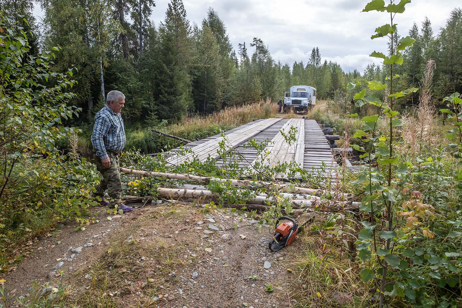 Заброска на северные территории нацпарка занимает два дня. День по бескрайним дорогам Карелии и Архангельской области, а затем на вездеходной технике до первого кордона. По асфальту и проселочным дорогам на УАЗе от Петрозаводска до поселка Золотуха - 450-500 километров. Далее, вездеходным ГАЗоном, по лесным дорогам - до места стоянки болотохода. В Золотухе краткий ночлег в мобильном блоке - жилом "контейнере". И снова в путь – с ремонтами мостов и объездом препятствий до места стоянки вездехода ТРЭКОЛ.