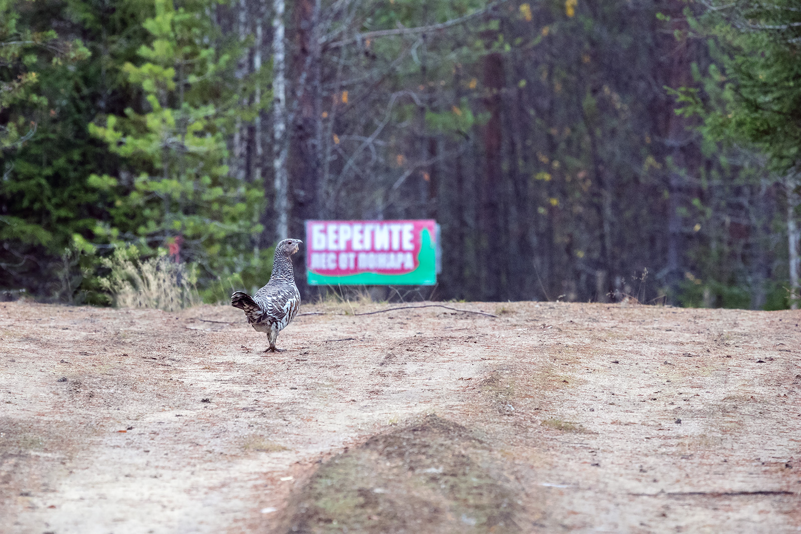 История фотографии. Возвращаемся с инспекторского кордона на озере Пелозеро к Пелозерской экологической тропе, проложенной через четырехкилометровое болото. Далее в планах подняться по порогам реки Илекса к урочищу Калгачиха, где один из самых северных кордонов Национального парка. И вот виднеется информационный аншлаг у начала тропы. А по дороге неспешно идет копала - самка глухаря. Идти до аншлага ей оставалось метров 300-400. В УАЗике кроме меня - сотрудники Онежского Филиала Национального парка. Все одновременно задаются вопросом, подойдет ли глухариха к плакату для фотографии? И мы начинаем медленно двигаться вслед за птицей.