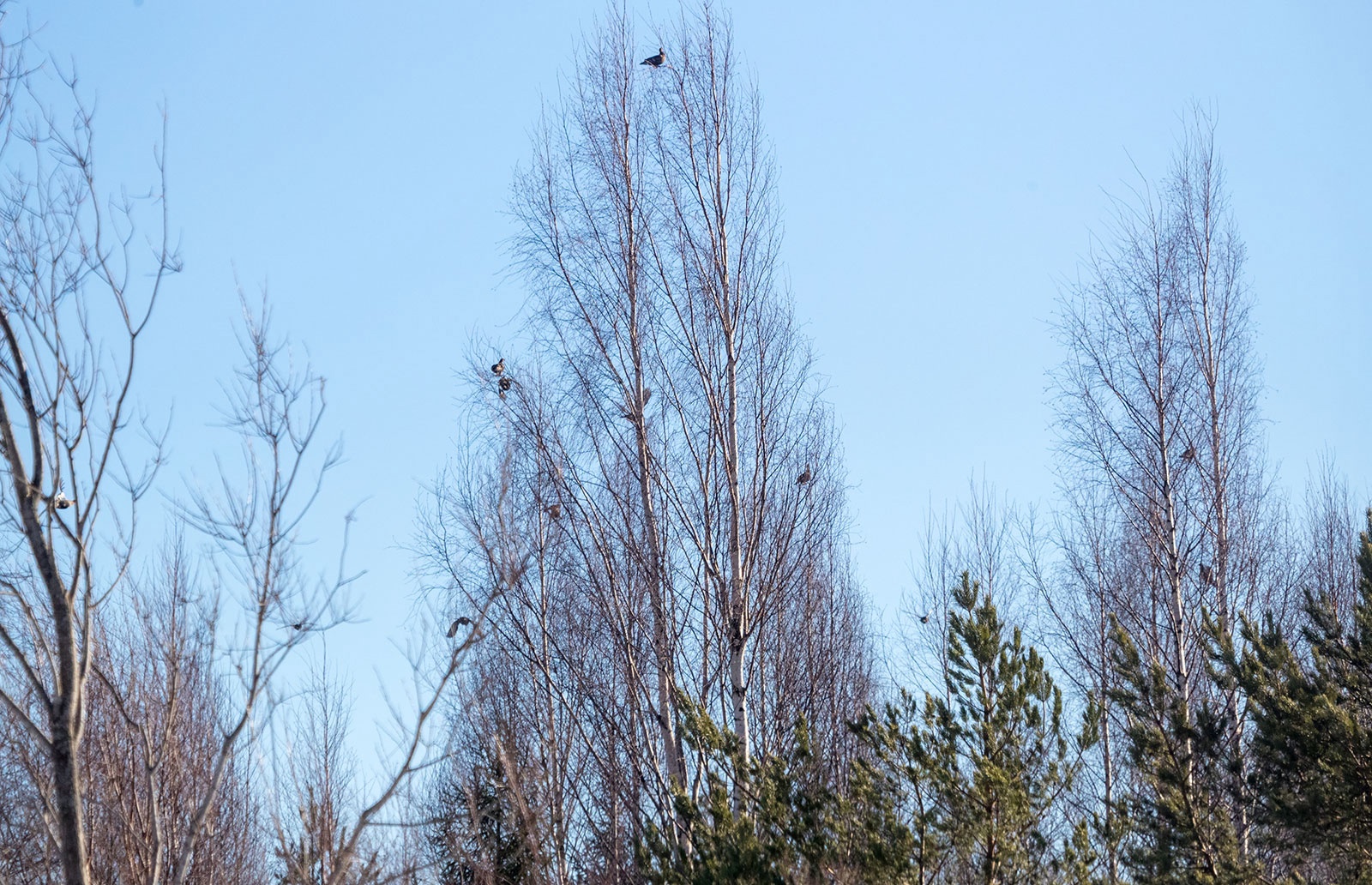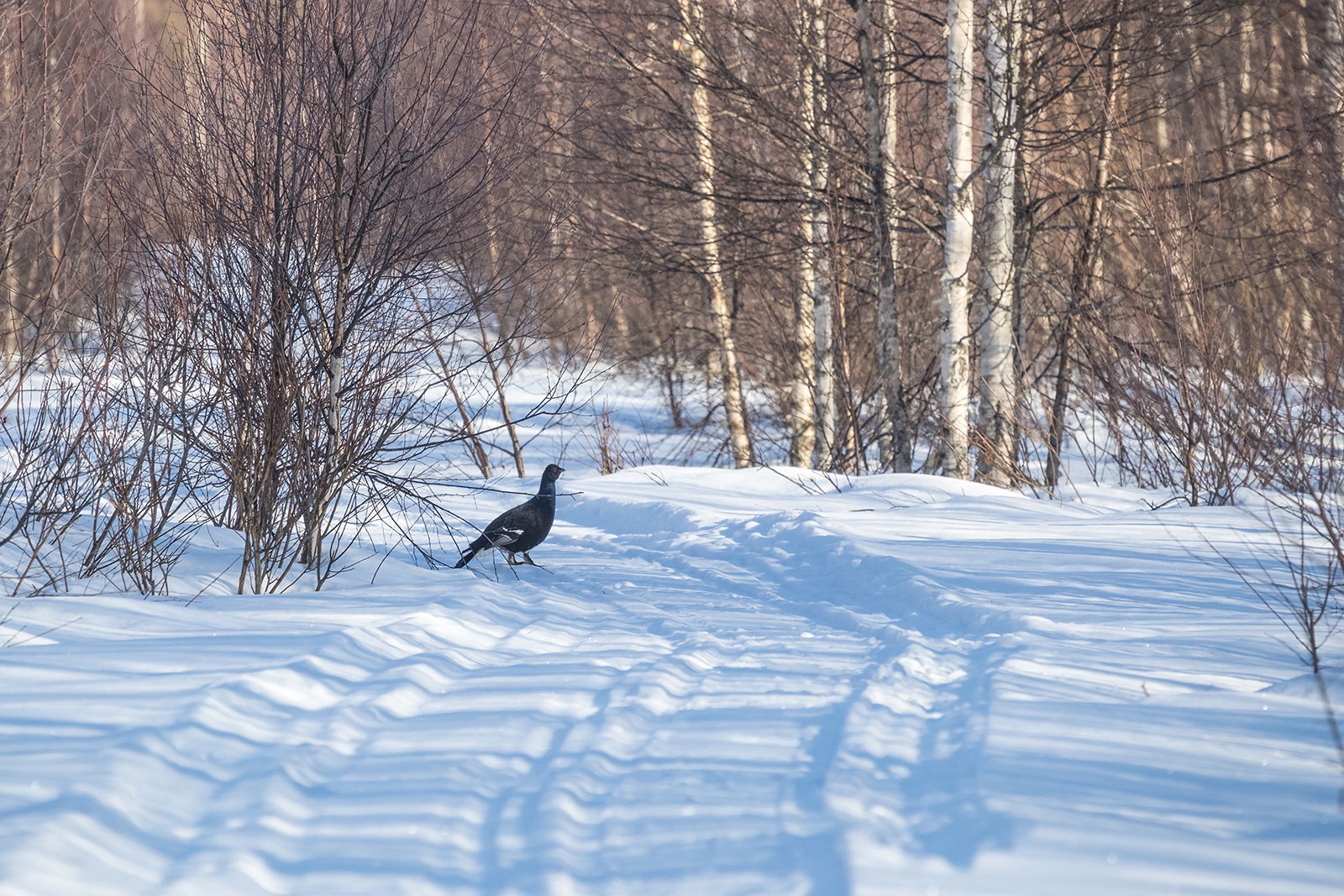 Кроме лосей, мы встретили глухаря, который пешком ходил по лесу, тетеревов, которые кормились на кронах деревьев по краям лесных полей и болот. А еще был замечен бобр, который прямо посреди светлого времени суток заготавливал молодые побеги осинки и затаскивал их в свою снежную нору. Активность бобра днем - это яркий признак весны, так как в другое время года они работают преимущественно ночами, а весной их биоритм меняется вместе с длительностью светового дня и подъемом уровня воды в ручьях, реках и озерах.