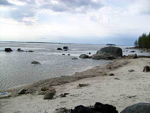 Решил попытать счастья - пойти караулить косачей в месте их вылета и залета на материк. Медлено продвигаюсь по прибрежному бурелому.