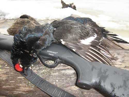 Беру бинокль в руки и понимаю, что пока я тут крался берегом, ток заврешился и косачи разлетелись... Только один петушок сидит на льду в токовой позе, но не токует. Решил постоять и подождать... Льдину с косачом притянуло к камню, где брачевались чайки, и последние выгнали косача со льда. А полетел он в мою сторону. И более того. Летит прямо с лоб. Я замер в ожидании, когда можно будет поднять ружье. Метров 40 - поднимаю ружье стреляю, мимо