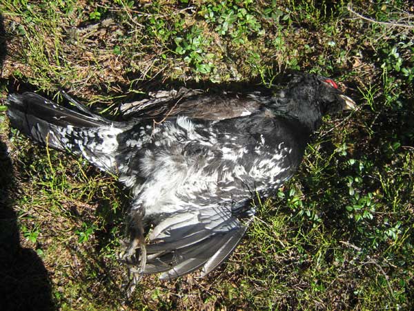 Картина стала ясна. Глухарь пел боком ко мне. Распустив хвост, но сложив крылья. Выстрел пришелся кучно в крыло. Плотное перо сыграло роль щита. Жизненной силы хватило, что бы могучий великан сбежал от места погибельного выстрела на семьдесят метров. Первый раз смертельно раненная птица перелетела на соседнее дерево, а потом, громко хлопая крылами, пикируя, упала замертво на самую вершину холма среди болот…