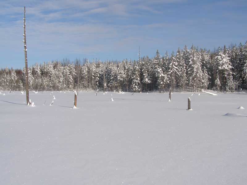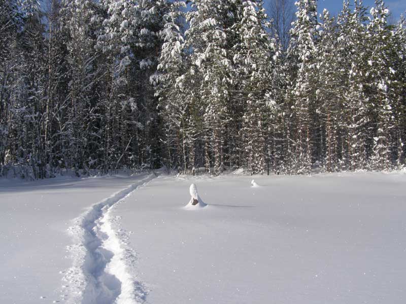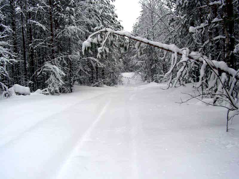 Последние 30 км - дорога явно давно не чистилась - 1-2 передача. В одном месте образовался затор из лесовоза, микроавтобуса, нивы, снегохода ямаха-винкинг. Забурились в сугроб и курили, пока все в горку по каше заедут.