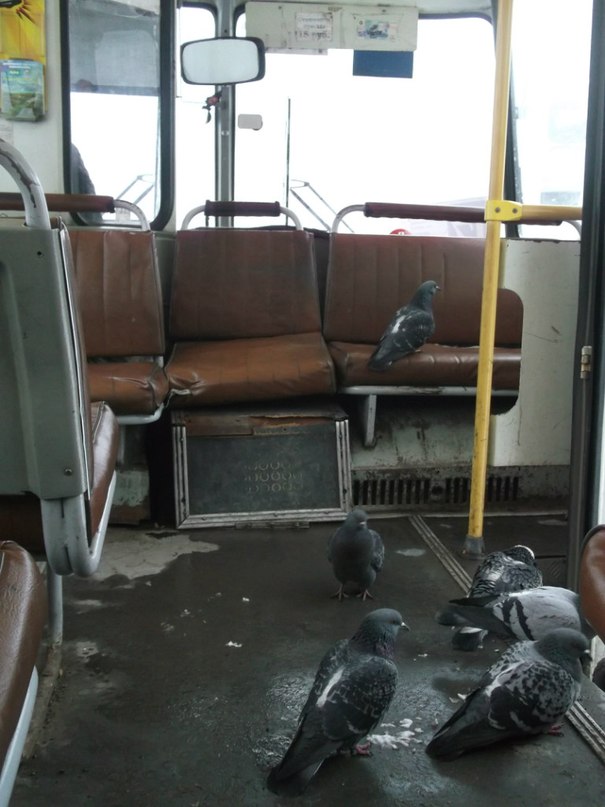 Да, до чего погода птиц довела! Интересно, а они так между ног у народа и шныряют во время движения и под сидениями прячутся, чтоб не наступили?