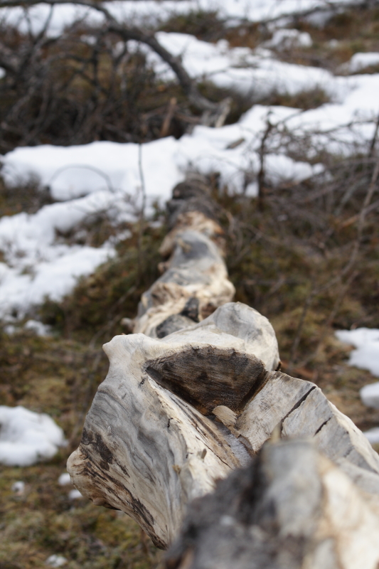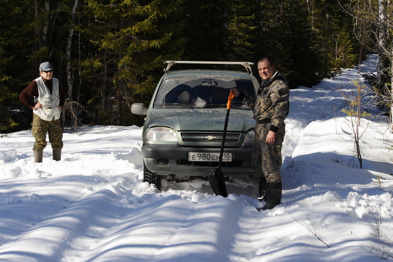 Хотя и ехалось тяжело, по настоящему откапываться пришлось только два раза. Остальные: своевременная остановка, раскидывание бруствера снега и ходом опять вперед. Увы, мужикам пришлось практически всю дорогу топать пешком. Впрочем, их это не особо расстроило. Тем более, по дороге много следов, есть чего посмотреть. Тут заяц пробежал, тут лось натоптал, медведь поднялся