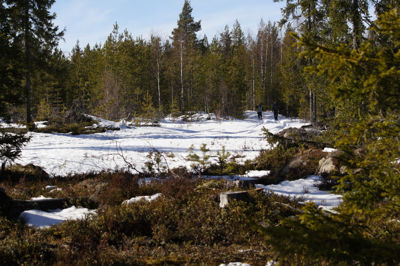 Практически сразу разделяемся, Леха ушел на чуфыканье косачей искать их ток. Мы с дядкой пошли дальше по дороге, верхом по насту. Большое кол-во старых лосинных следов, наконец лежки. Прямо на дороге одна, вторая, еще и еще. Следы, конечно, уже расплылись, сложно что-то определить, но по орешкам получилось, что три лося, Стандартно: бык, корова, телок. Вышли на речку, с моста которой я хотел покидать спин, но …. Увы, ничего не растаяло. Пополоскал безрезультатно только на обратном пути блесну в окне под мостом. Прошли мимо солонца, его за зиму просто сгрызли, у лося все вытоптано. Следов вокруг него тьма. Это хорошо, надо будет подсыпать соли. Вот уже и по насту нахожено перед нами. Потом слетает копылуха. Дорога петляет и выходит к болоту и, наконец, мы его увидели. Далековато, конечно, сделал снимок. Объектив 55-250, больше не вытянуть. Зато в бинокль его рассмотрели. Да, это токовик, глухарь старый. Видно, что большой. Но гарантий пока никаких, что ток. Начинаем осторожно перемещаться, должна же быть где-то молодежь. Наконец, вдвоем с дядкой кричим (шепотом, разумеется): "Да вот же еще один!". Я фотографирую, он снимает на камеру. Потом я смотрю, что он куда-то не туда снимает. Тут выясняется, что мы смотрим на разных глухарей. И сидят они рядом, метров 50 друг от друга. Просто мы под разными углами смотрим и для каждого из нас другой глухарь не виден. Молодые. Т.к. все-таки светло, осторожно уходим. Предполагаем, что нашли. Мороз отпустил, температура пошла на плюс и наст стал предательски хрустеть, местами даже проваливаться. При таком варианте, на охоте к этой группе даже не подойди - распугаешь.