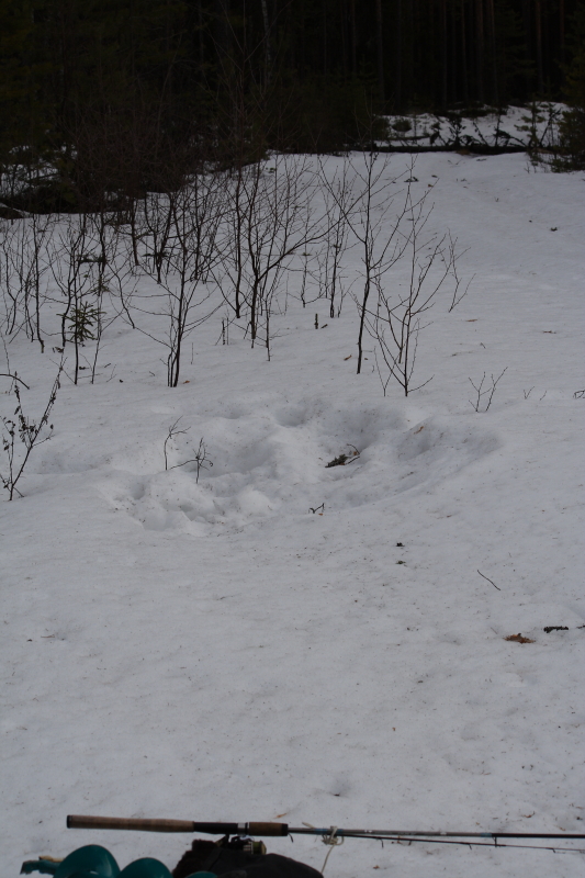 Вроде бы и все, но на обратном пути остановились на озере, что подходило близко к дороге. Решили пополоскать блесны. Засверлились, слышим - далеко косачи чуфыкают, ответили. Вдруг налетает стая и все кругом рассаживаются. И тут же токовать. Пофотографировали их. Стоим, болтаем и вдруг у меня в удочку удар, да такой сильный, что я чуть удочку не уронил. Чувствую, что щука и сопротивляется хорошо. Леска 0.2, думаю, как бы не порвать. 2-3 секунды борьбы, щука перекусывает леску и мой новый балансир на первой поклевке переходит к подледному монстру. Тьфу! В жизни никогда ничего на балансиры не ловил, ну не умею, а тут... Да и хрен с ним, главное - позитив. Еще побегав с полчаса, поймав трех мальков, собрались и двинулись до дому.