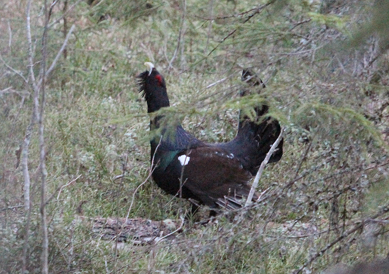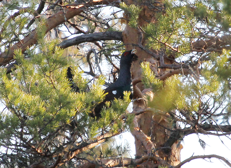 Последним был сердитый глухарь в 9-00. Хотел снять его в полете. А он ни в какую. Я и посвищу, и гимн спою. И ногой по дереву потопаю. Он все также - помолчит и вновь токует. В конце концов я поднял палку и бросил в его сторону. Но он, глупый птиц, не улетел. Только развернулся и петь перестал. Устал я ждать, опустил камеру, снял кепку, и в этот момент глухарь меня покинул. Полетная сессия не удалась.