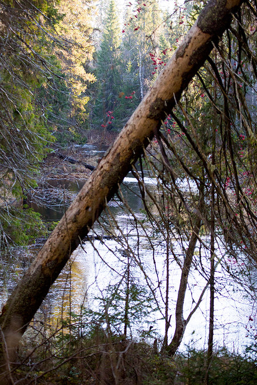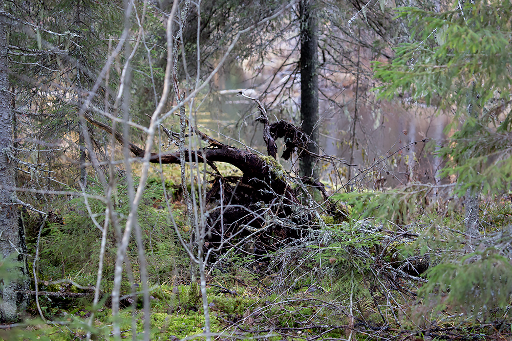 Медленно пробираясь сквозь естественный старый лес и ветровальные старые деревья (скорее всего здесь не было рубки леса), приближаюсь к краю лесного бугорка и берегу реки.